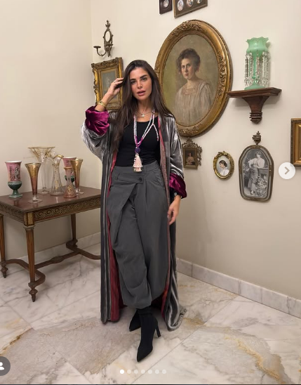 تألقت زوجة كريم فهمي في الصور بإطلالة عصرية، حيث ارتدت بنطلون باللون الرمادي مع توب أسود اللون، ونسقت معهما كيمونو متناسق مع الأجواء الرمضانية.