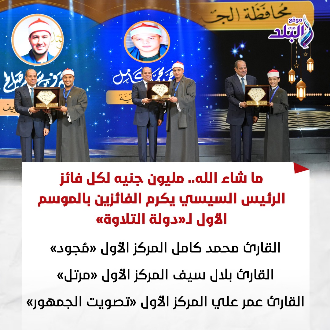 كرم الرئيس عبد الفتاح السيسي، خلال احتفال ليلة القدر اليوم، الفائزين في مسابقة التلاوة الموسم الأول، ومنح كل فائز جائزة ملية قدرها مليون جنيه.