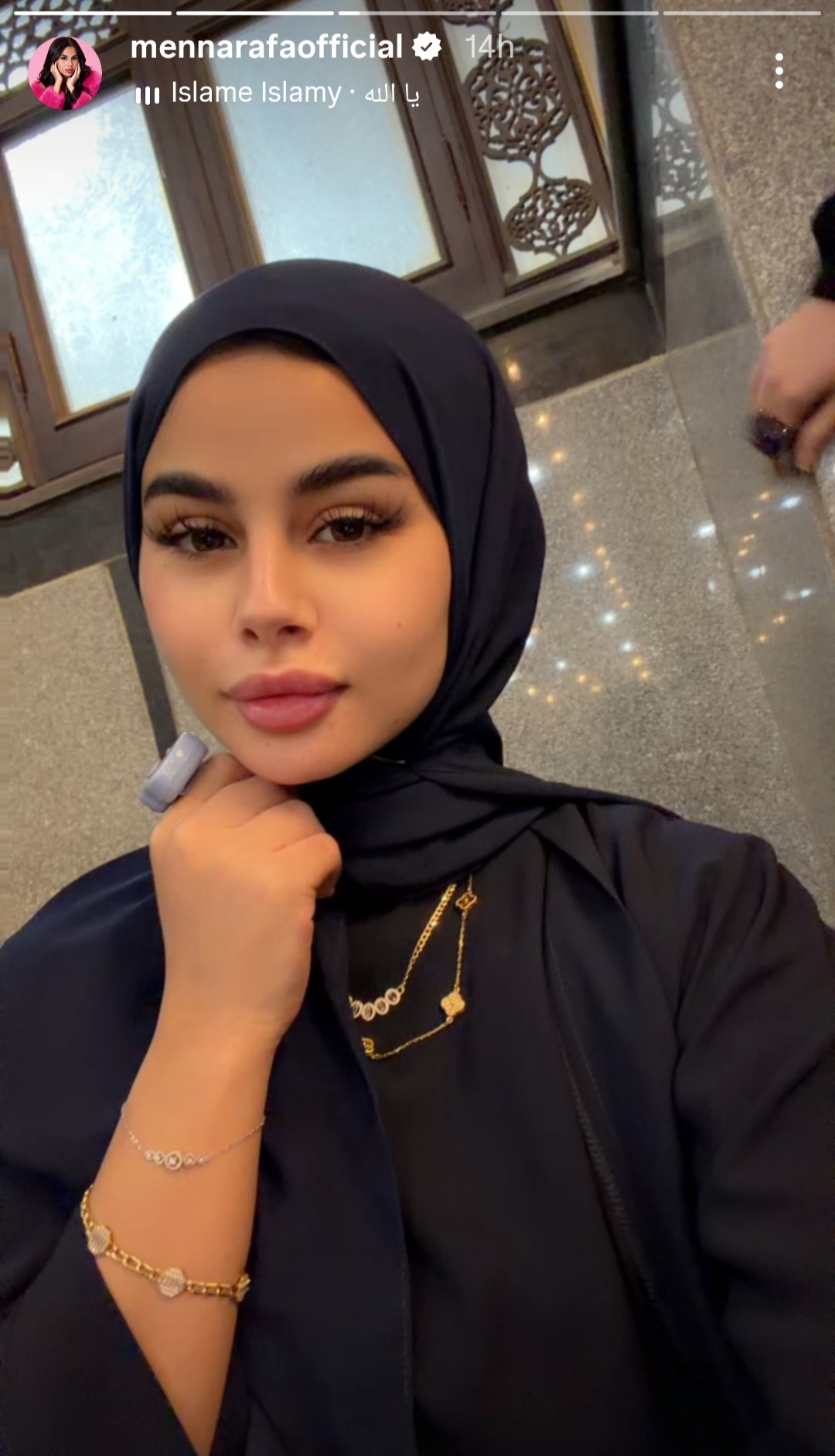 وظهرت منه عرفة في الصور بإطلالة رمضانيه محتشمه مرتدية عباءة سوداء و طرحة بنفس اللون ،مما نالت الصورة إعجاب متابعيها.