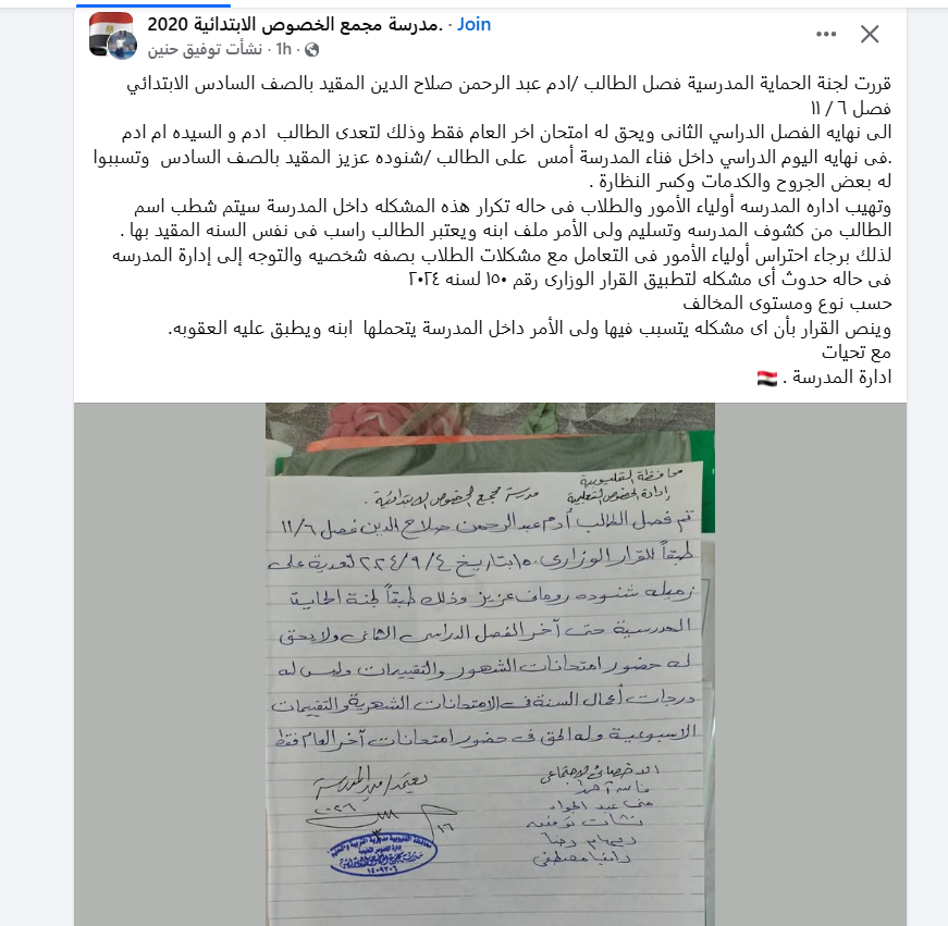 أصدرت مدرسة مجمع الخصوص الابتدائية التابعة لإدارة الخصوص التعليمية بالقليوبية ، قراراً عاجلاً بفصل الطالب آدم عبد الرحمن صلاح الدين المقيد بالصف السادس الإبتدائي فصل ٦ / ١١ ، حتى نهاية الفصل الدراسي الثاني ، وحرمانه من آداء الامتحانات الشهرية والتقييمات ودرجات أعمال السنة ، على أن يسمح له فقط بدخول امتحانات آخر العام .