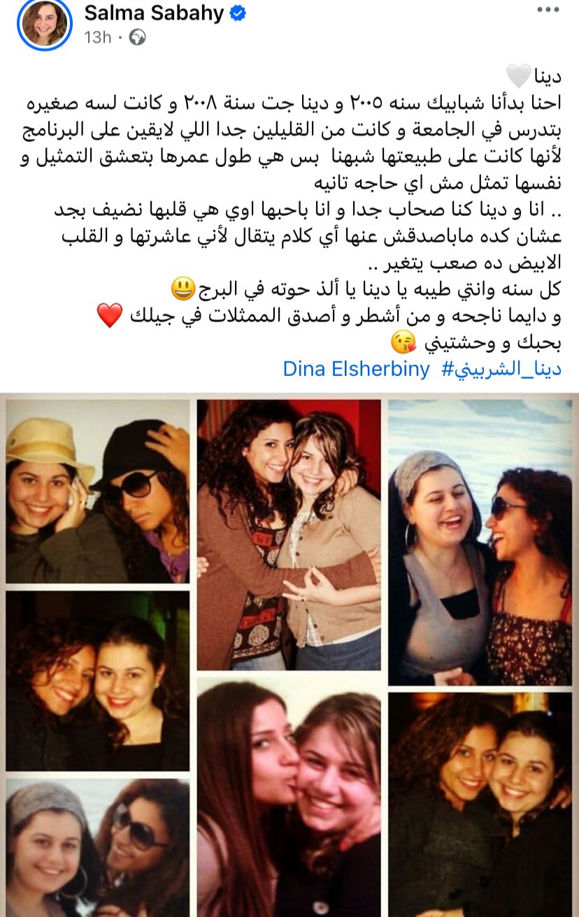 وكتبت سلمى صباحى، عبر حسابها الرسمى على «فيسبوك»: «دينا.. احنا بدأنا شبابيك سنه 2005 ودينا جت سنة 2008 وكانت لسة صغيرة بتدرس فى الجامعة وكانت من القليلين جدا اللى لايقين على البرنامج لأنها كانت على طبيعتها شبهنا، بس هى طول عمرها بتعشق التمثيل ونفسها تمثل مش أى حاجة تانية».
