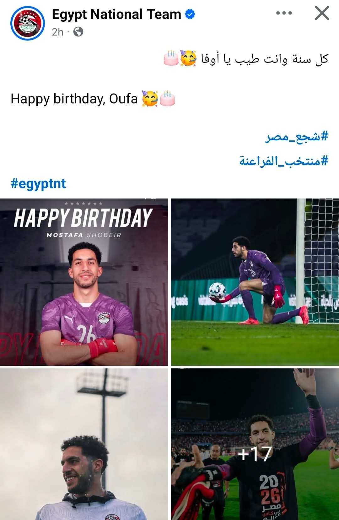 وكتبت صفحة المنتخب احتفالا بعيد ميلاد اللاعب باللغتين العربية والإنجليزية: "كل سنة وانت طيب يا أوفا".