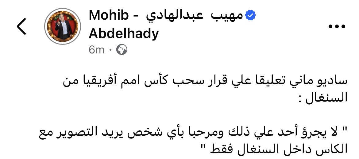 وكشف الإعلامي مهيب عبد الهادي، عن تعليق السنغالي ساديو ماني على قرار سحب كأس الأمم الأفريقية، وقال: "لا يجرؤ أحد علي ذلك ومرحبا بأي شخص يريد التصوير مع الكأس داخل السنغال فقط".