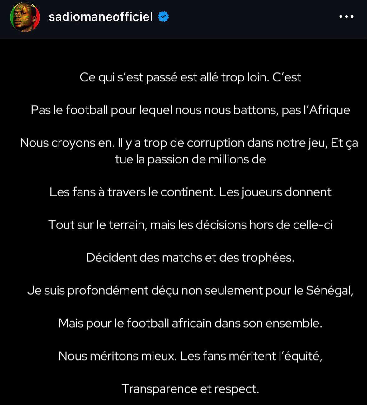 وكتب النجم السنغالي ساديو ماني على حسابه الرسمي في انستجرام: “ما حصل تجاوز كل الحدود، هذه ليست كرة القدم التي نكافح من أجلها، وليست إفريقيا التي نؤمن بها”.