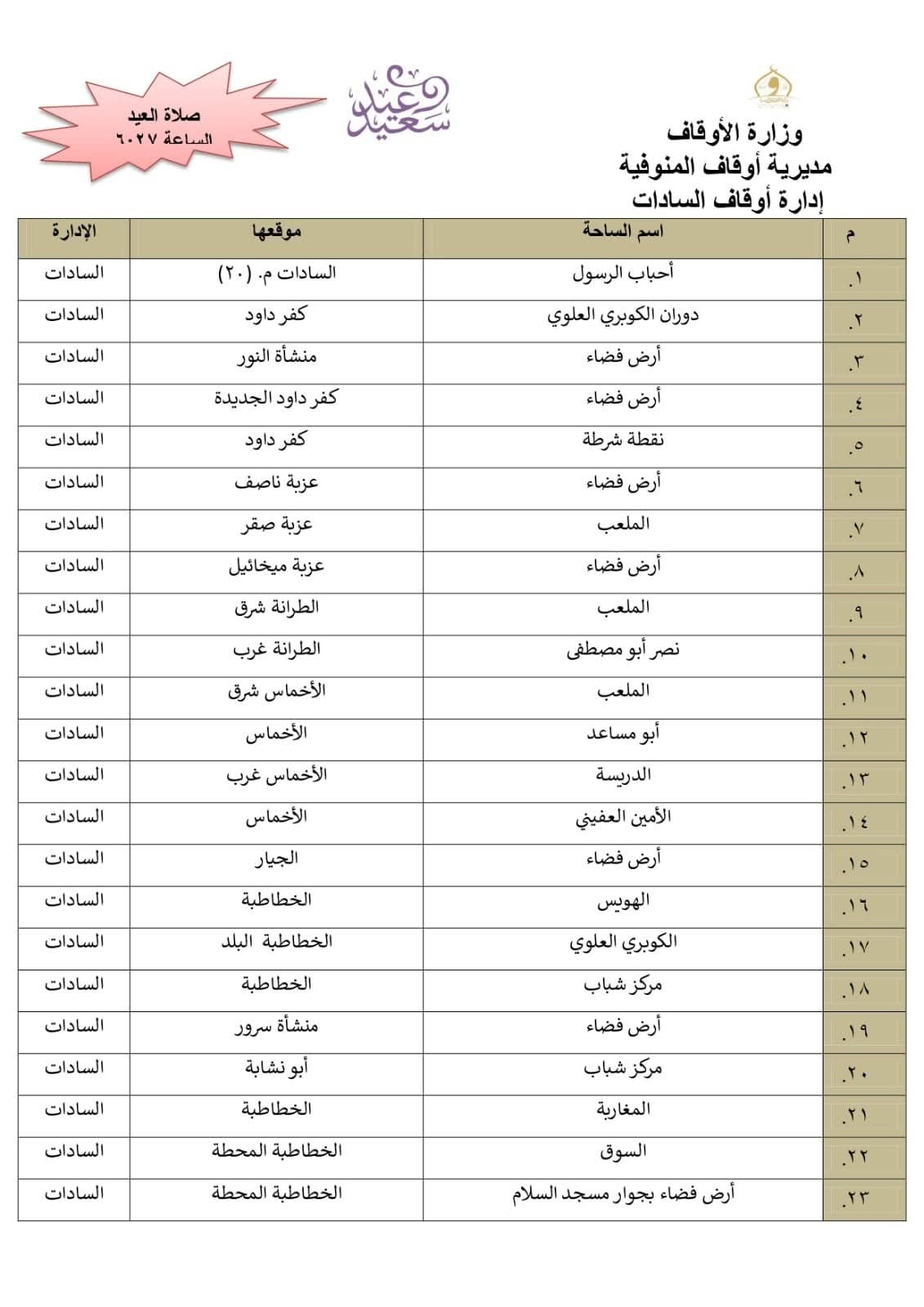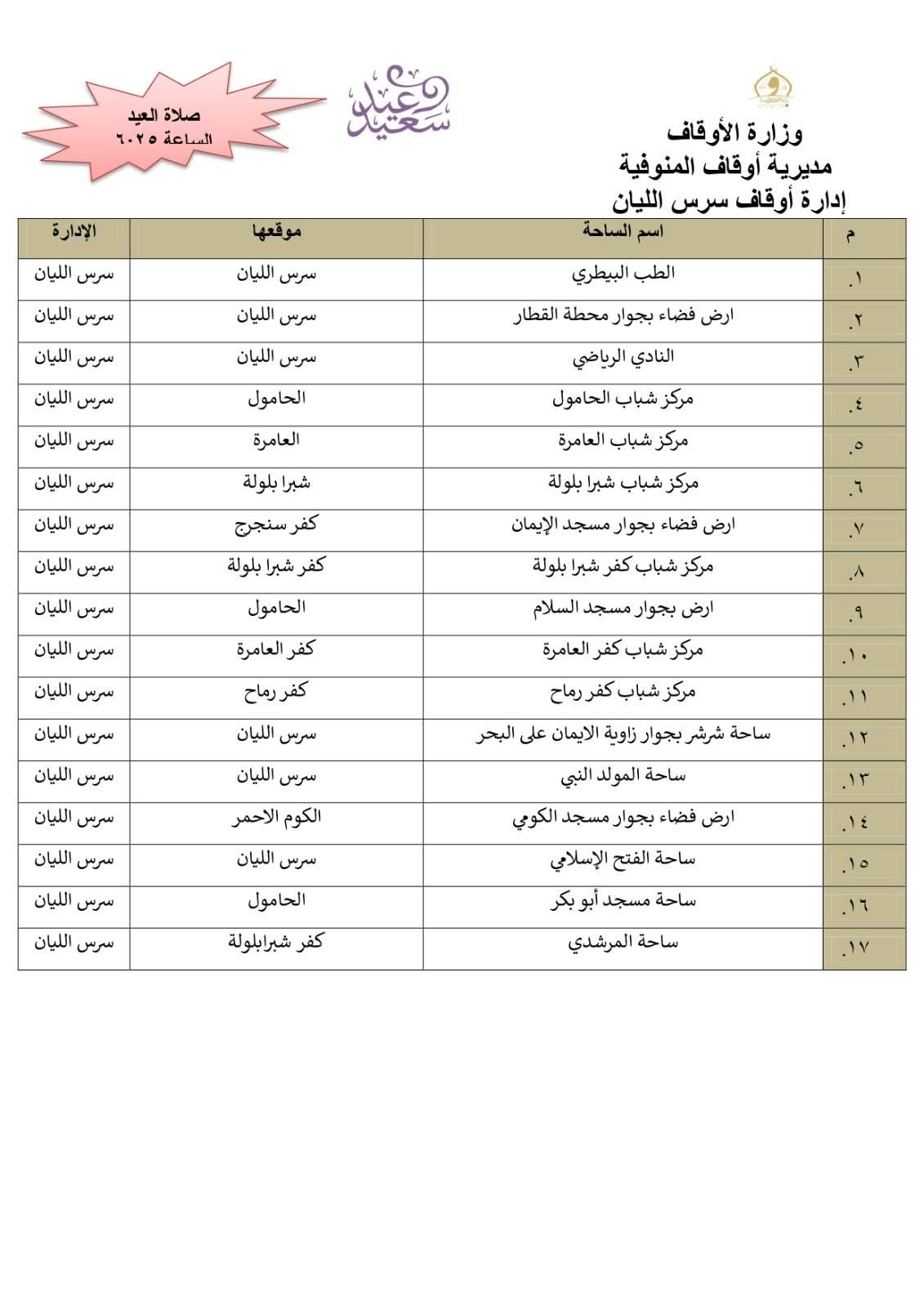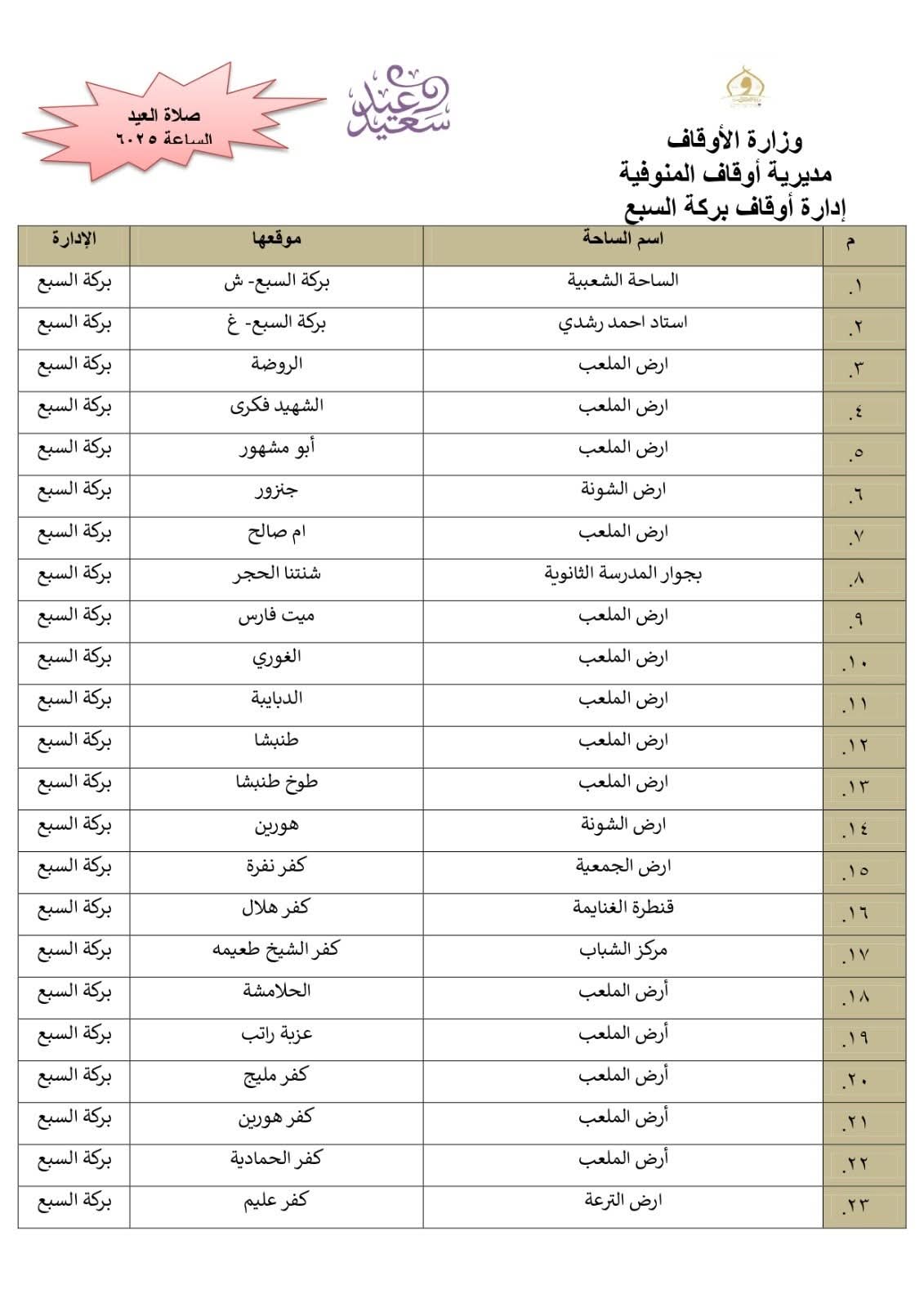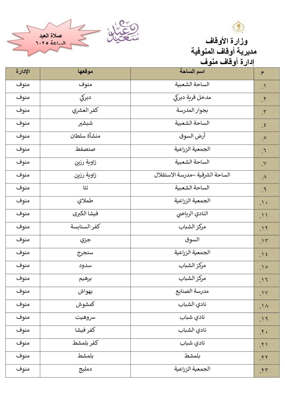 أعلن الدكتور معوض حماد مدير مديرية أوقاف المنوفية، أن المديرية أنهت استعدادها التام وتجهيز 511 ساحة بجميع أرجاء المحافظة إلي جانب المساجد الكبرى ، ومراعاة تهيئة أماكن مناسبة لكبار السن وذوى الهمم .