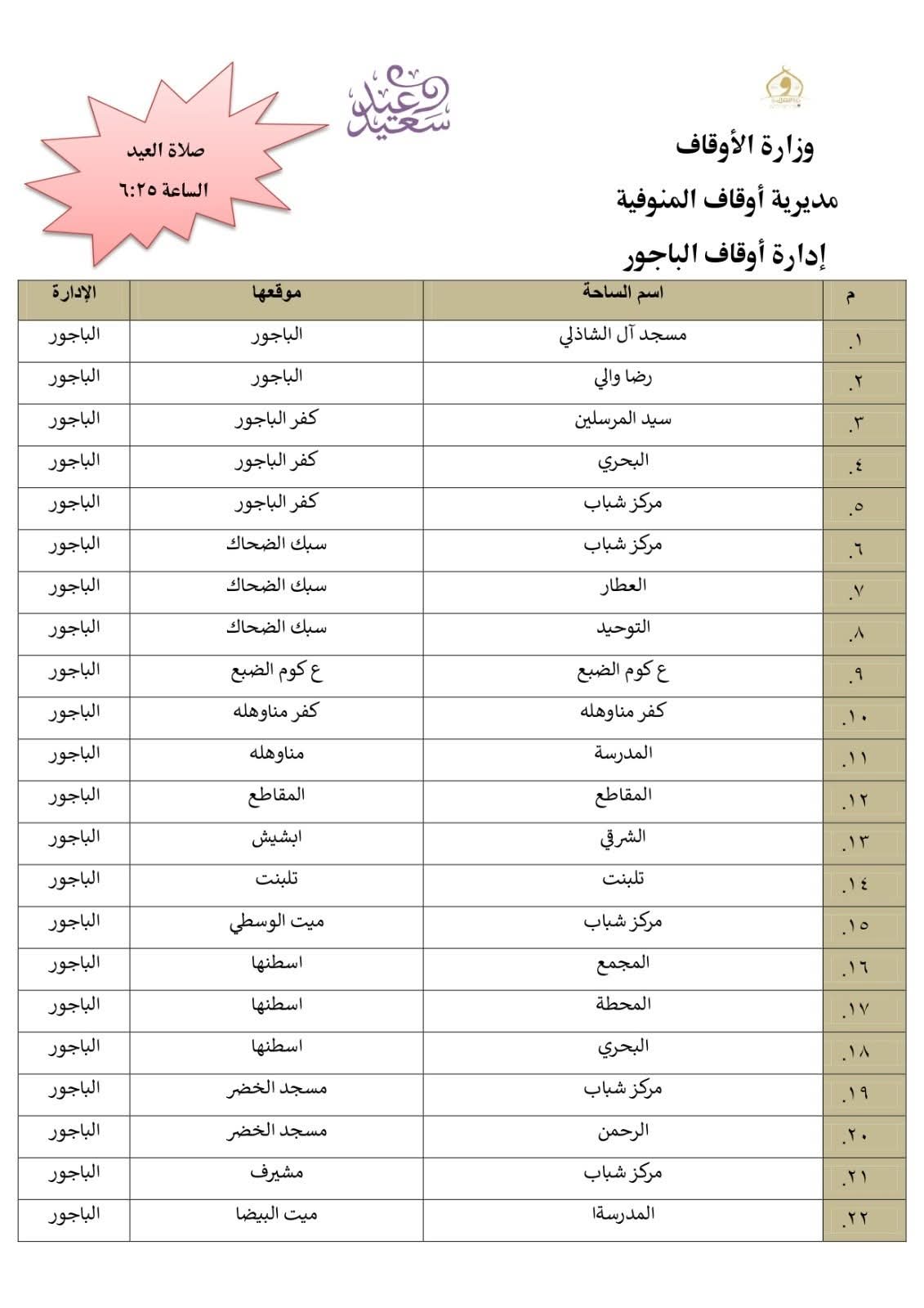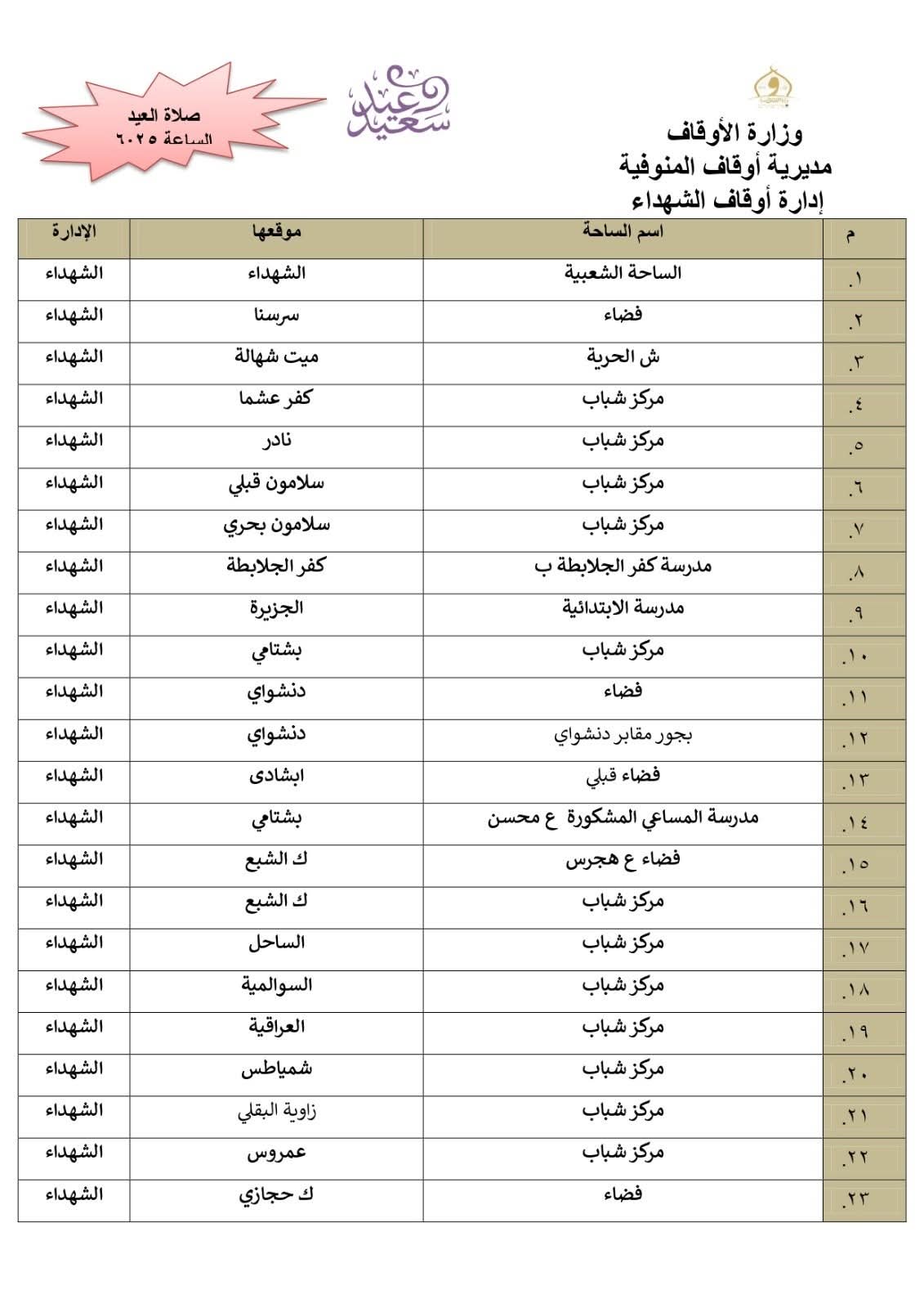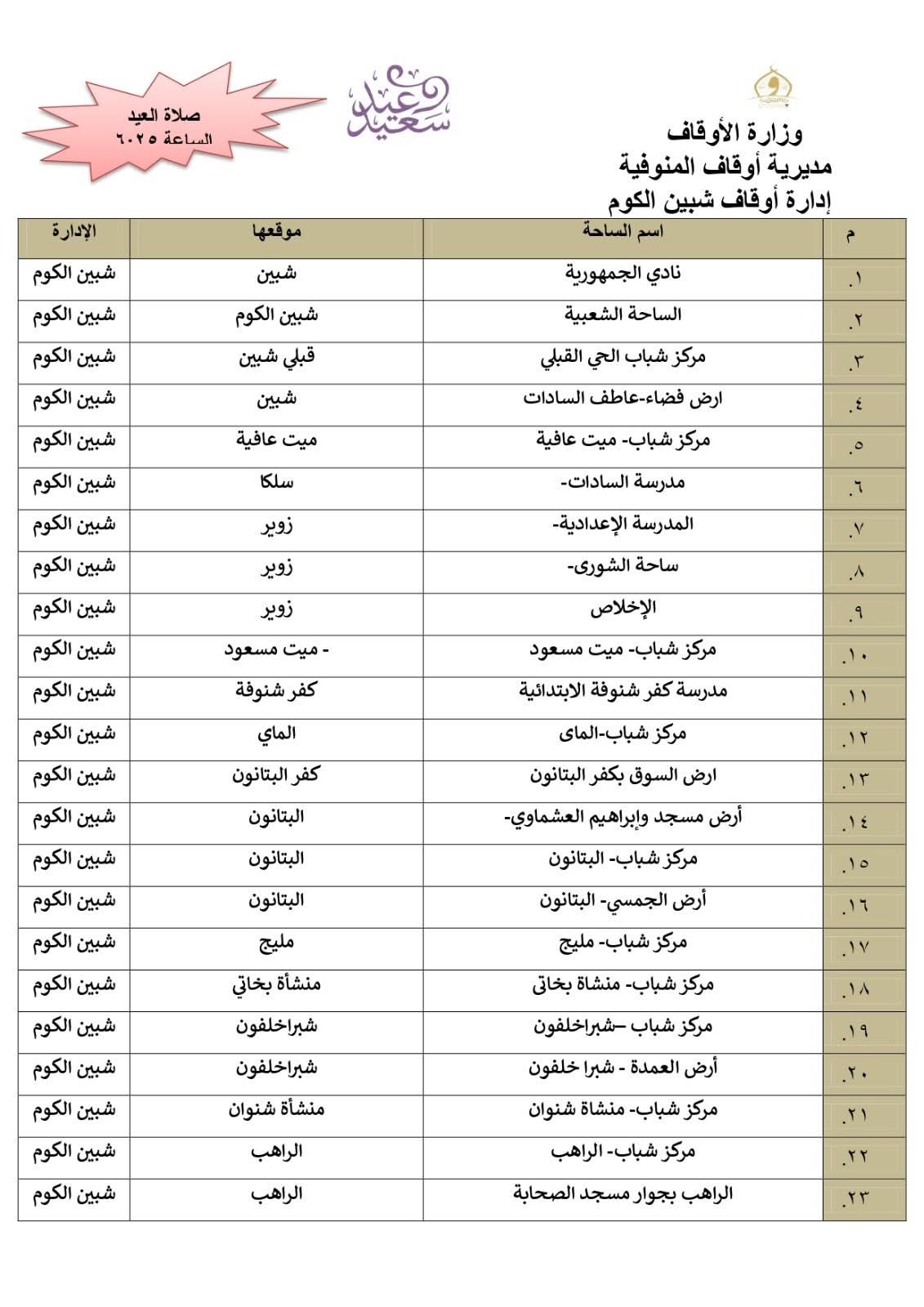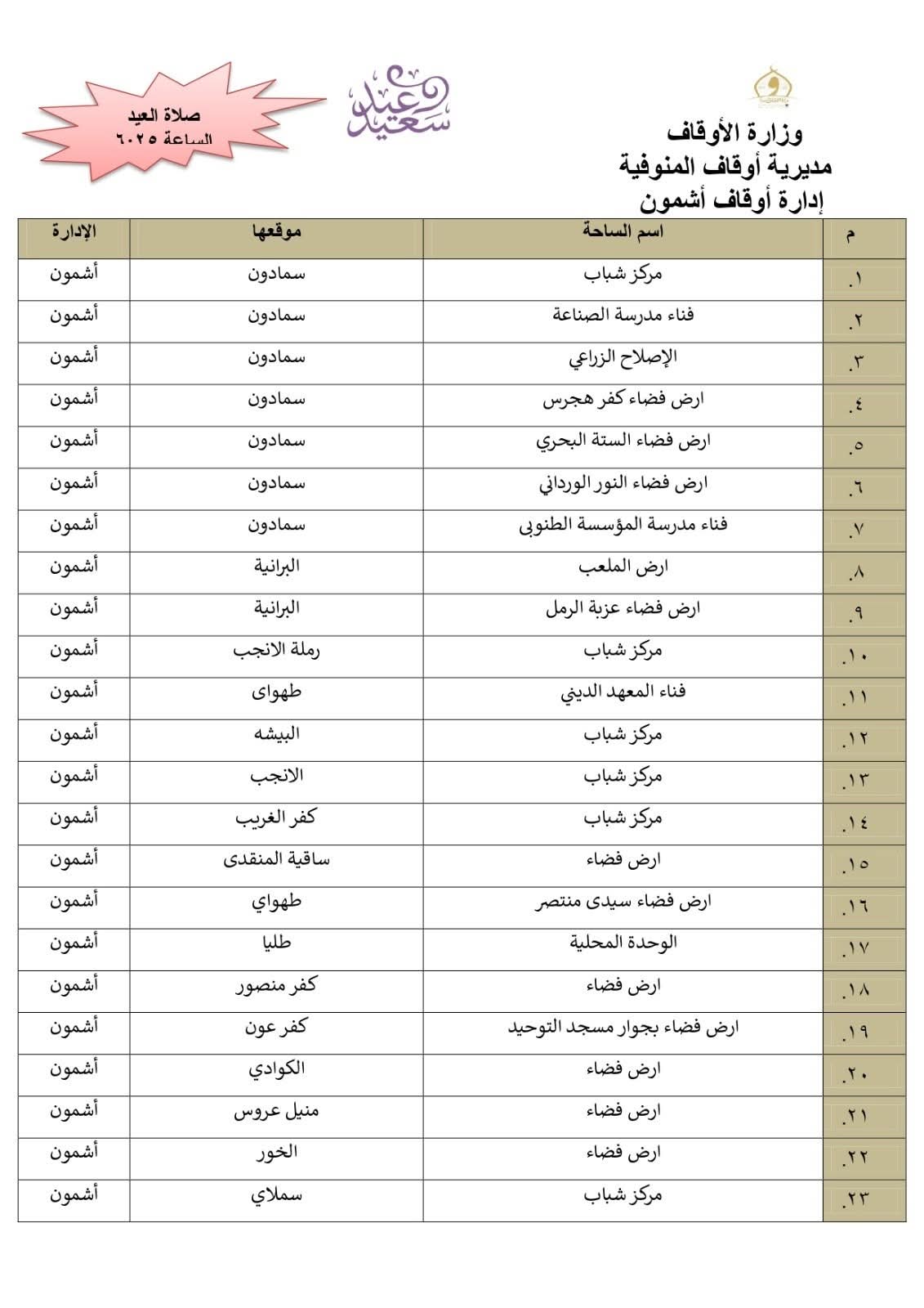 أعلن الدكتور معوض حماد مدير مديرية أوقاف المنوفية، أن المديرية أنهت استعدادها التام وتجهيز 511 ساحة بجميع أرجاء المحافظة إلي جانب المساجد الكبرى ، ومراعاة تهيئة أماكن مناسبة لكبار السن وذوى الهمم .