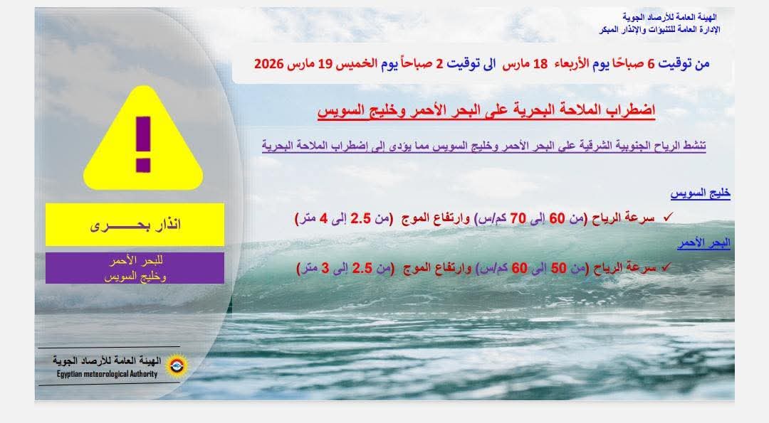 اكدت الأرصاد، وجود اضطراب الملاحة البحرية (الأحمر)، على بعض المناطق من سواحل البحر الأحمر وخليج السويس، وسرعة الرياح من (50 إلى 70) كم/س وارتفاع الأمواج من (2.5 إلى 4) متر، ويوجد ايضا اضطراب في الملاحة البحرية (المتوسط)، على بعض المناطق من سواحل (السلوم - مطروح - العلمين - الإسكندرية - بلطيم)، وسرعة الرياح من (50 إلى 60) كم/س وارتفاع الأمواج من (2.5 إلى 3) متر.