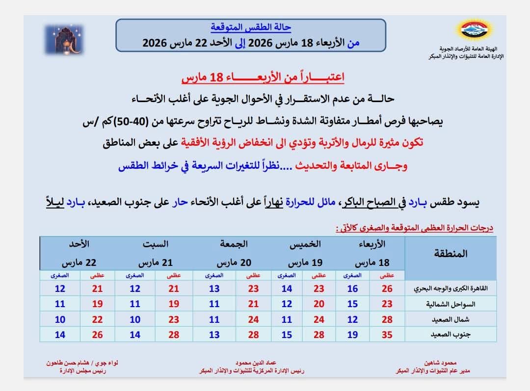 يسود اليوم الأربعاء 18 مارس 2026، طقسا بارداً خلال فترات الصباح الباكر والليل، غائم وبارد إلى دافئ خلال ساعات النهار على كافة الأنحاء، حيث كشفت الهيئة العامة للأرصاد الجوية، عن حالة الطقس المتوقعة اليوم الأربعاء وحتى أول أيام العيد، محذرة من حالة عدم الاستقرار التي ستشهدها على أغلب الأنحاء.