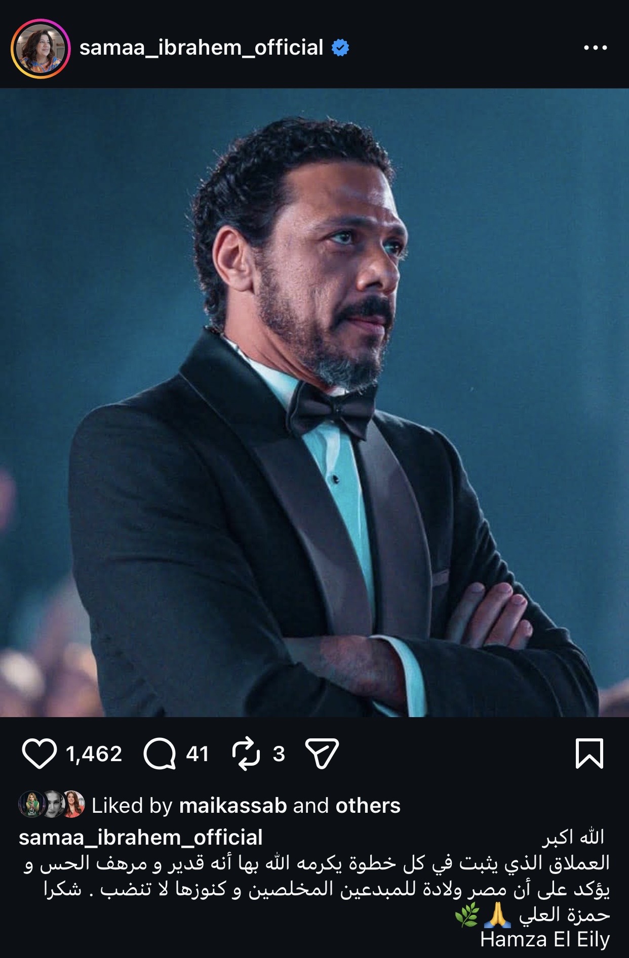 وكتبت سما إبراهيم عبر حسابها الشخصي بموقع إنستجرام: "اللّه اكبر العملاق الذي يثبت في كل خطوة يكرمه اللّٰه بها أنه قدير و مرهف الحس و يؤكد على أن مصر ولادة للمبدعين المخلصين وكنوزها لا تنضب . شكراً