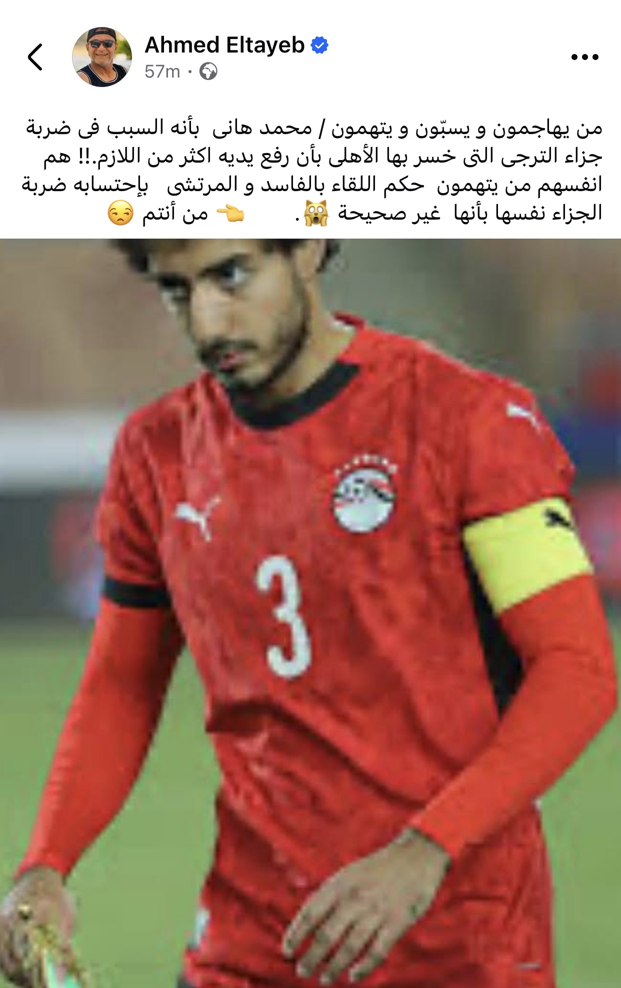 وكتب أحمد الطيب عبر حسابه علي فيسبوك "من يهاجمون و يسبّون و يتهمون محمد هانى بأنه السبب فى ضربة جزاء الترجى التى خسر بها الأهلى بأن رفع يديه اكثر من اللازم هم انفسهم من يتهمون حكم اللقاء بالفاسد و المرتشى بإحتسابه ضربة الجزاء نفسها بأنها غير صحيحة من أنتم"