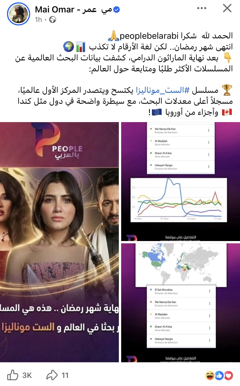 وكتبت مي عمر عبر حسابها الرسمي بموقع التواصل الاجتماعي فيسبوك : الحمد لله انتهى شهر رمضان لكن لغة الأرقام لا تكذب كشفت بيانات البحث العالمية عن المسلسلات الأكثر طلبًا ومتابعة حول العالم".