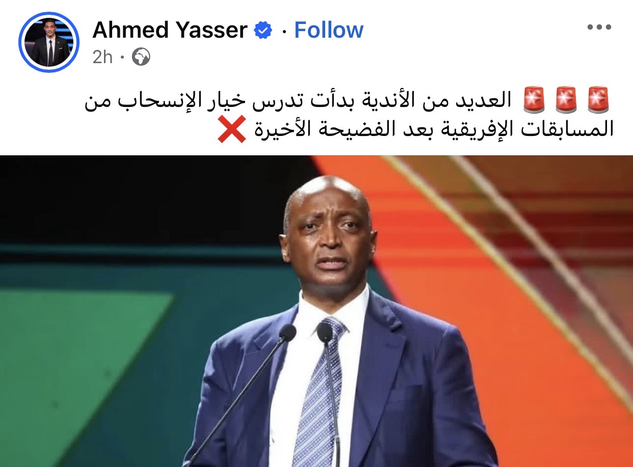 وكتب أحمد ياسر، نجم الكرة المصرية السابق، عبر حسابه على “فيس بوك”: “العديد من الأندية بدأت تدرس خيار الانسحاب من المسابقات الإفريقية؛ بعد الفضيحة الأخيرة”.