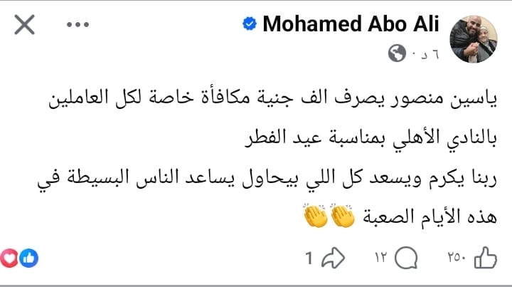 وكتب الناقد الرياضي محمد أبو علي، عبر حسابه على “فيس بوك”: "ياسين منصور يصرف ألف جنيه مكافأة خاصة لكل العاملين بالنادي الأهلي بمناسبة عيد الفطر، ربنا يكرم ويسعد كل اللي بيحاول يساعد الناس البسيطة في هذه الأيام الصعبة".