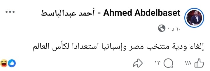 وكتب عبد الباسط عبر حسابه علي فيسبوك " إلغاء ودية منتخب مصر وإسبانيا استعدادا لكأس العالم"