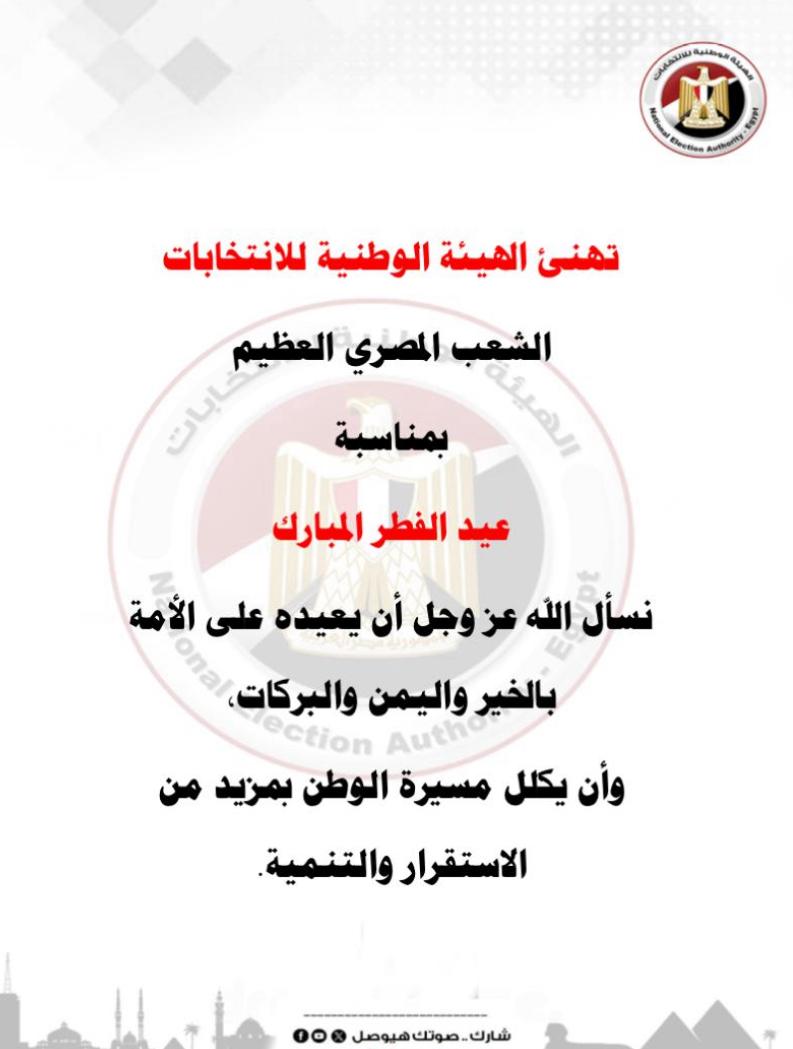 تقدمت الهيئة الوطنية للانتخابات بأسمى التهاني للشعب المصري العظيم بمناسبة عيد الفطر المبارك.