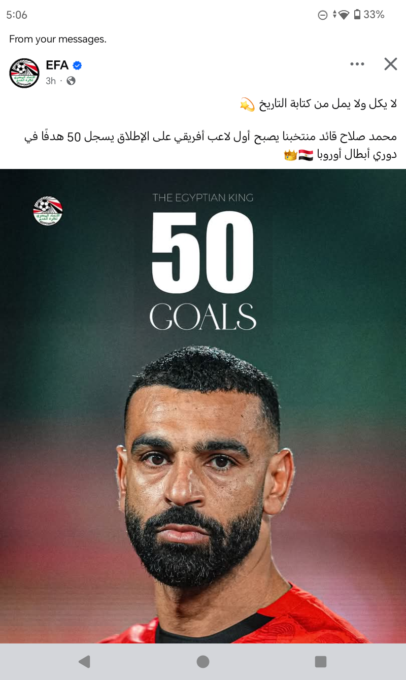 وكتبت الصفحة الرسمية لـ اتحاد الكرة عبر موقع التواصل الاجتماعي فيسبوك:"لا يكل ولا يمل من كتابة التاريخ، محمد صلاح قائد منتخبنا يصبح أول لاعب أفريقي على الإطلاق يسجل 50 هدفًا في دوري أبطال أوروبا ".