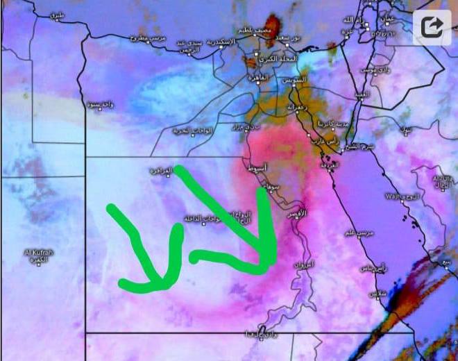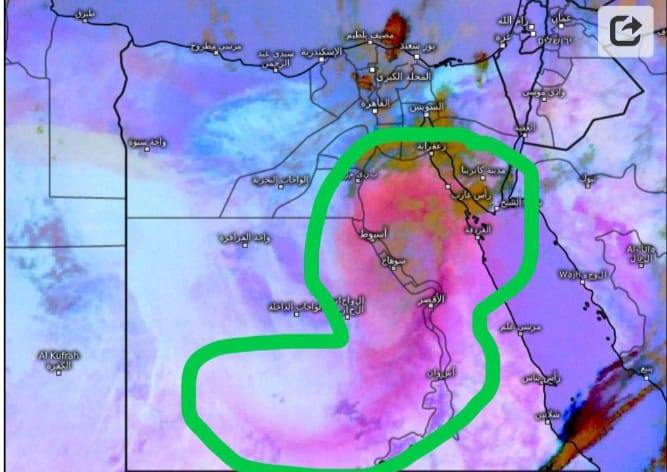 وتشير آخر تحديثات لصور الأقمار لبداية دخول الجبهه الهوائية الباردة المحملة بالأتربة والتى تظهر بالصوره باللون الأحمر