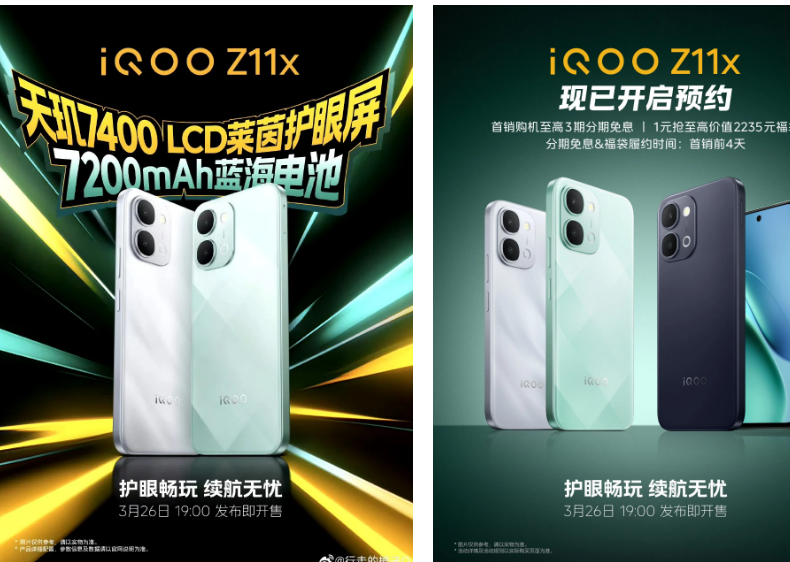 إلى جانب هاتف Z11، ستطرح iQOO أيضًا هاتف Z11x، الذي يتميز بشاشة LCD مقاس 6.76 بوصة مزودة بميزات حماية للعين، وشريحة Dimensity 7400، وبطارية بسعة 7200 مللي أمبير مع شحن سريع بقوة 44 واط. وسيتوفر بألوان الفضي والأخضر والأزرق الداكن.