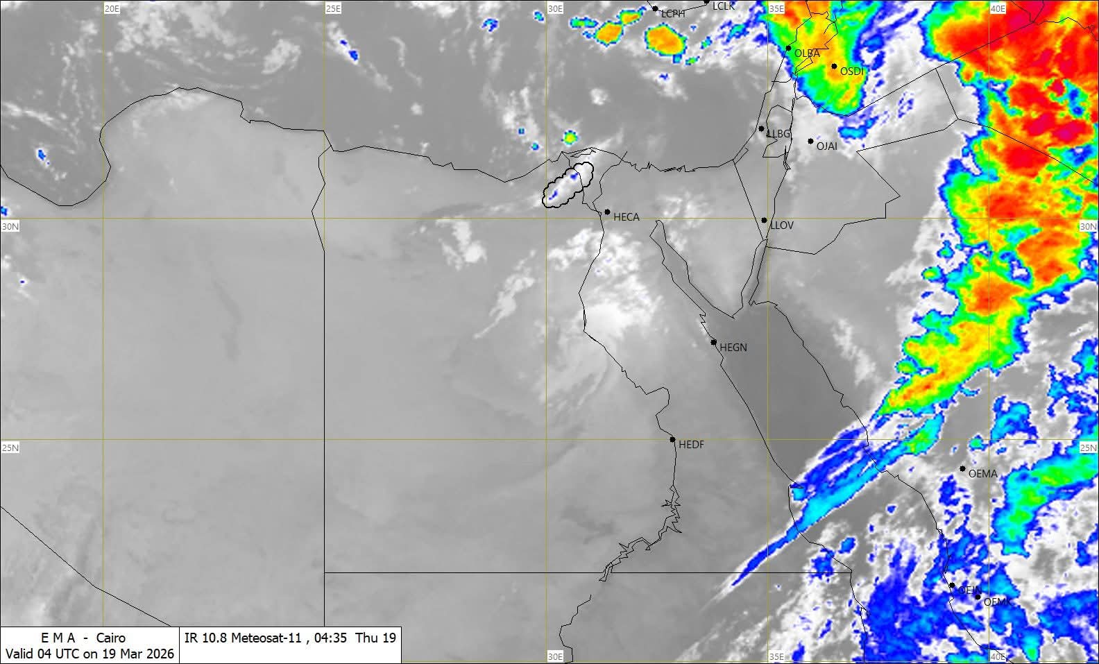 - فرص للأمطار الخفيفة إلى المتوسطة وقد تكون رعدية على السواحل الشمالية وقد تكون غزيرة وتصل لحد السيول على مناطق خليج العقبة وسيناء على فترات متقطعة.