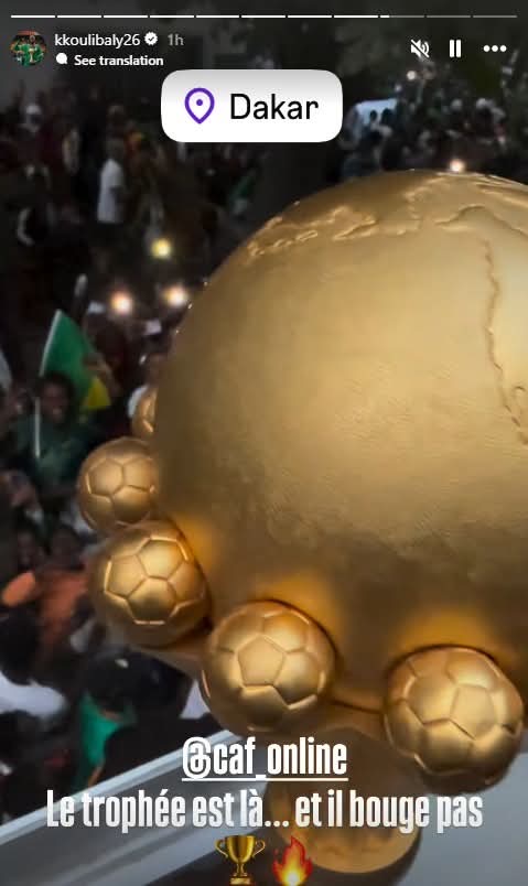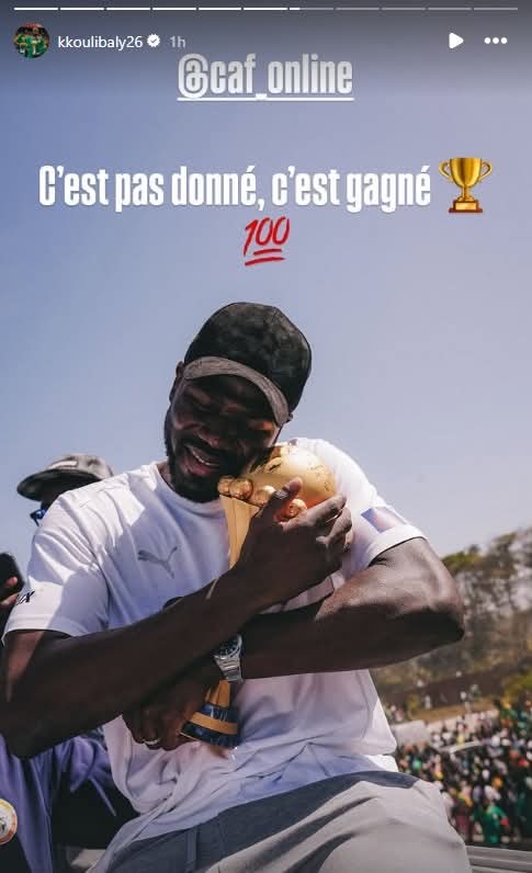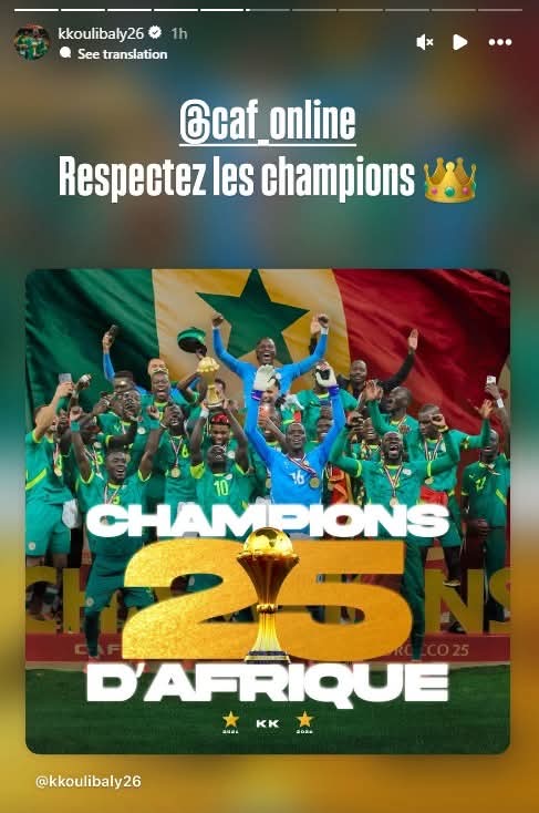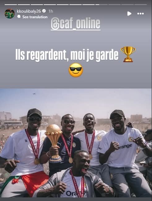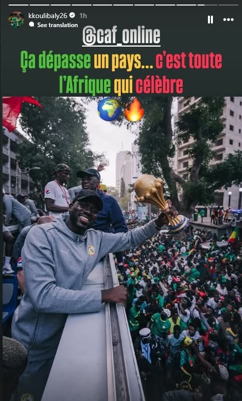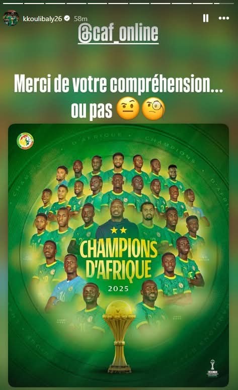 ونشر كوليبالي عدة رسائل نارية لـ كاف عبر خاصية “الاستوري” على حسابه الرسمي على موقع التواصل الاجتماعي “إنستجرام”وكتب "احترموا الأبطال.. هذا الكأس لم يُمنح لنا بل اكتسبناه.. أمم إفريقيا هنا في السنغال ولن تتزحزح.. الأمر يتجاوز حدود بلد واحد.. إفريقيا كلها تحتفل.. أنتم تشاهدون الكأس وأنا أحافظ عليه.. شكرًا لتفهمكم.. أو ربما لا"