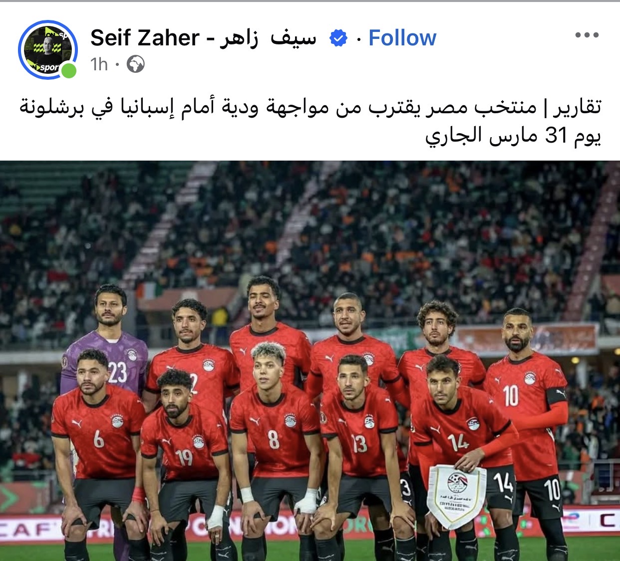 وكتب الإعلامي سيف زاهر عبر حسابه علي فيسبوك "تقارير | منتخب مصر يقترب من مواجهة ودية أمام إسبانيا في برشلونة يوم 31 مارس الجاري"