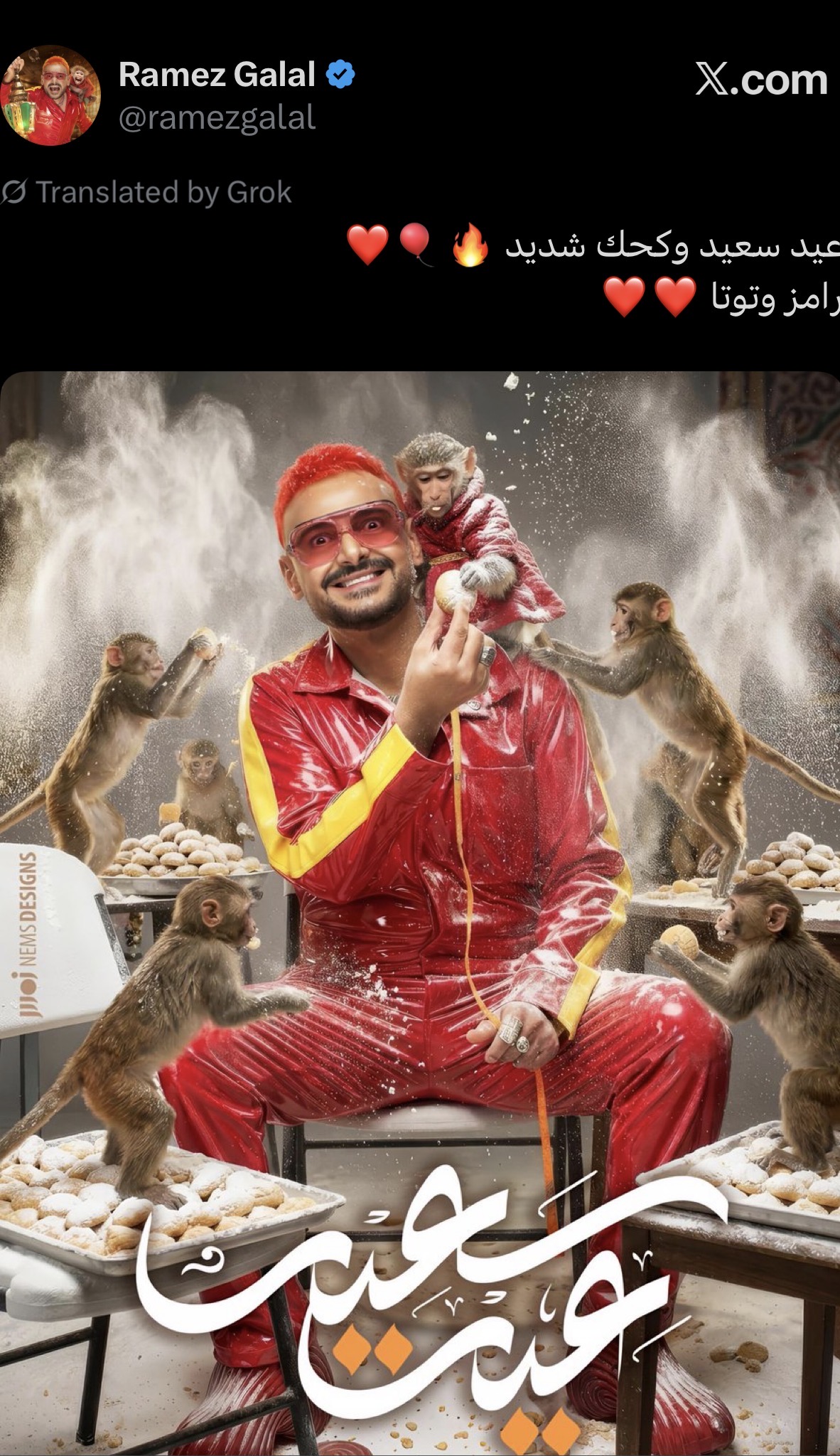 هنأ الفنان رامز جلال، جمهوره بمناسبة حلول عيد الفطر المبارك، خلال تغريدة على موقع التدوينات القصيرة "إكس".