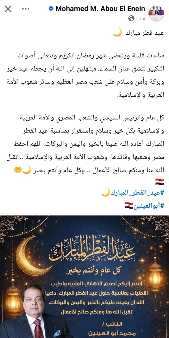 وأضاف النائب محمد أبو العينين: “كل عام والرئيس السيسي والشعب المصري والأمة العربية والإسلامية بكل خير وسلام واستقرار بمناسبة عيد الفطر المبارك، أعاده الله علينا بالخير واليمن والبركات".