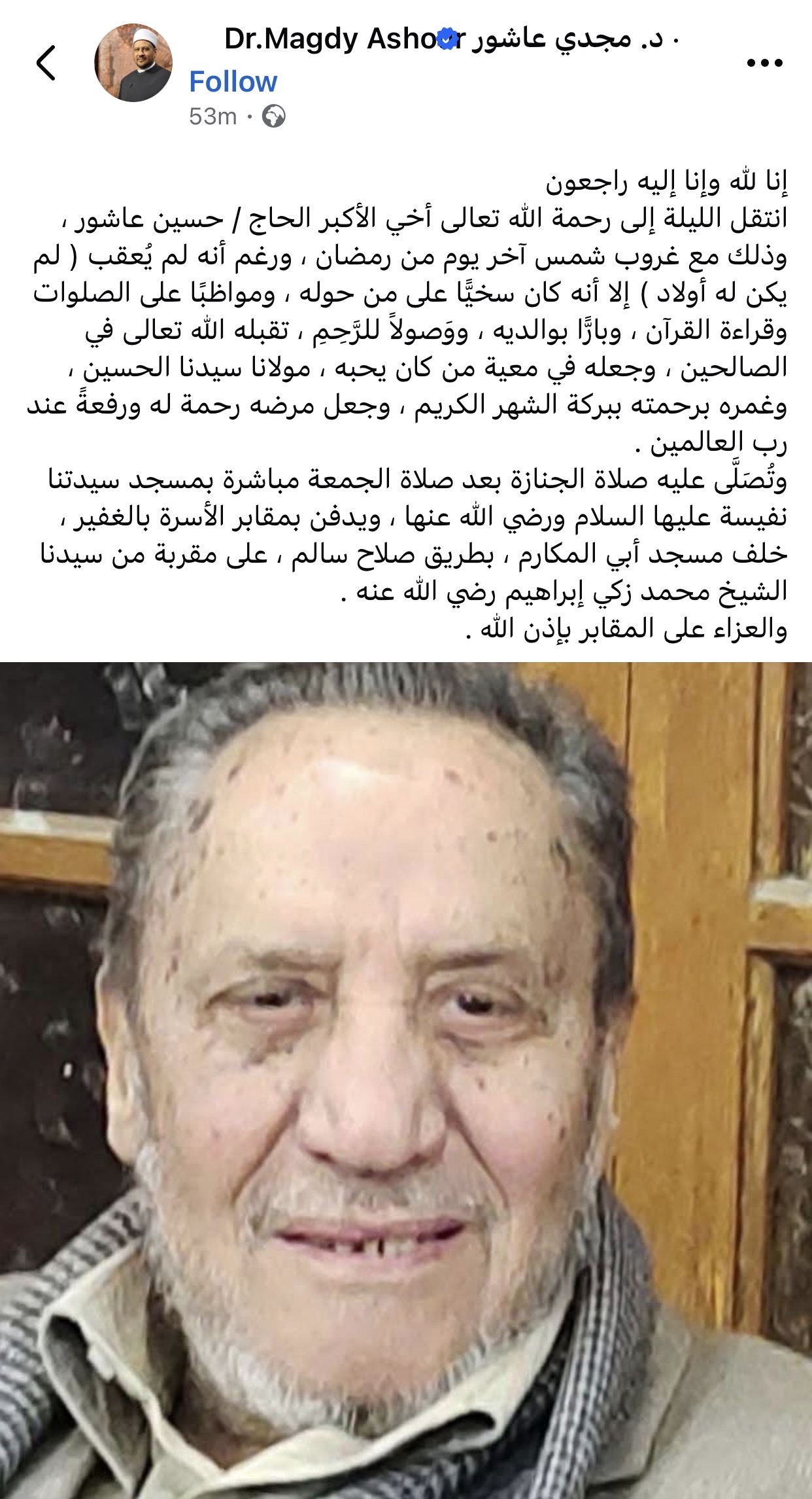 أعلن الدكتور مجدي عاشور، مستشار مفتي الجمهورية السابق، وفاة شقيقه الأكبر الحاج حسين عاشور، وذلك آخر يوم من شهر رمضان المبارك.