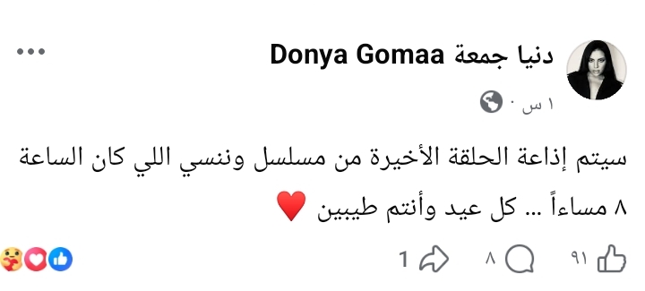 وكشفت الفنانة دنيا جمعة المشاركة في العمل عن موعد عرض الحلقة الأخيرة، وذلك من خلال حسابها الشخصي على فيسبوك، حيث كتبت : "سيتم إذاعة الحلقة الأخيرة من مسلسل وننسى اللي كان الساعة 8 مساءً .. كل عيد وأنتم طيبين".