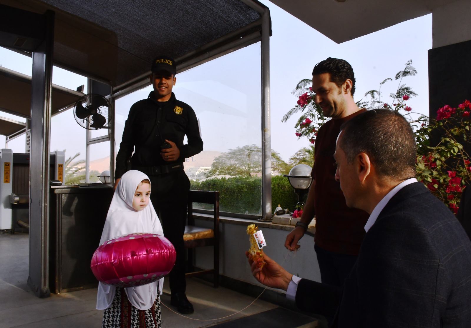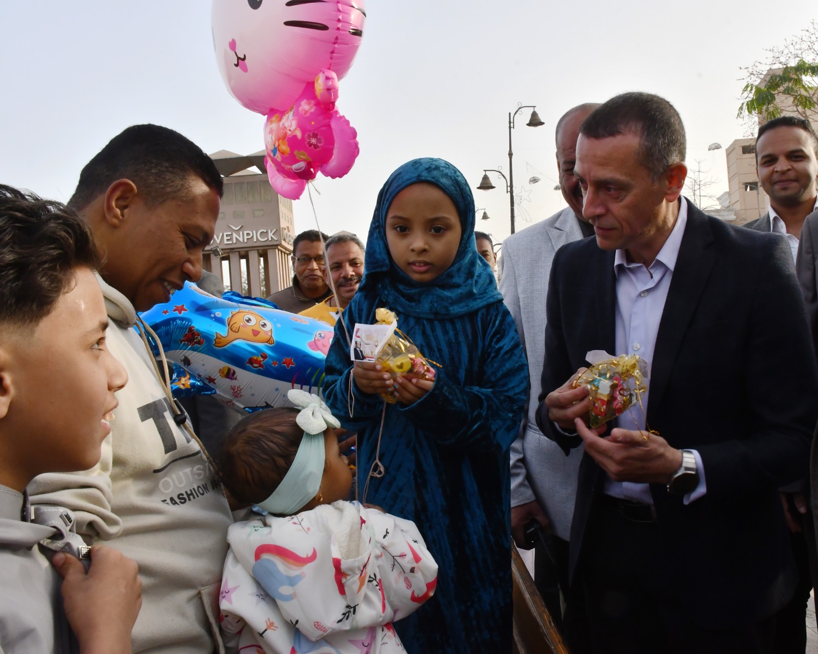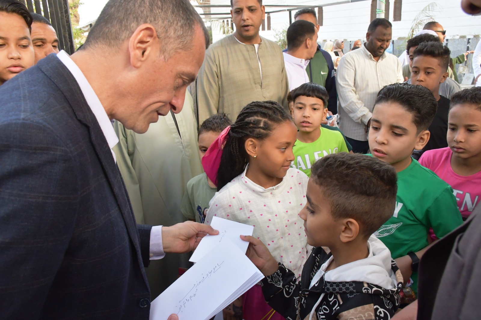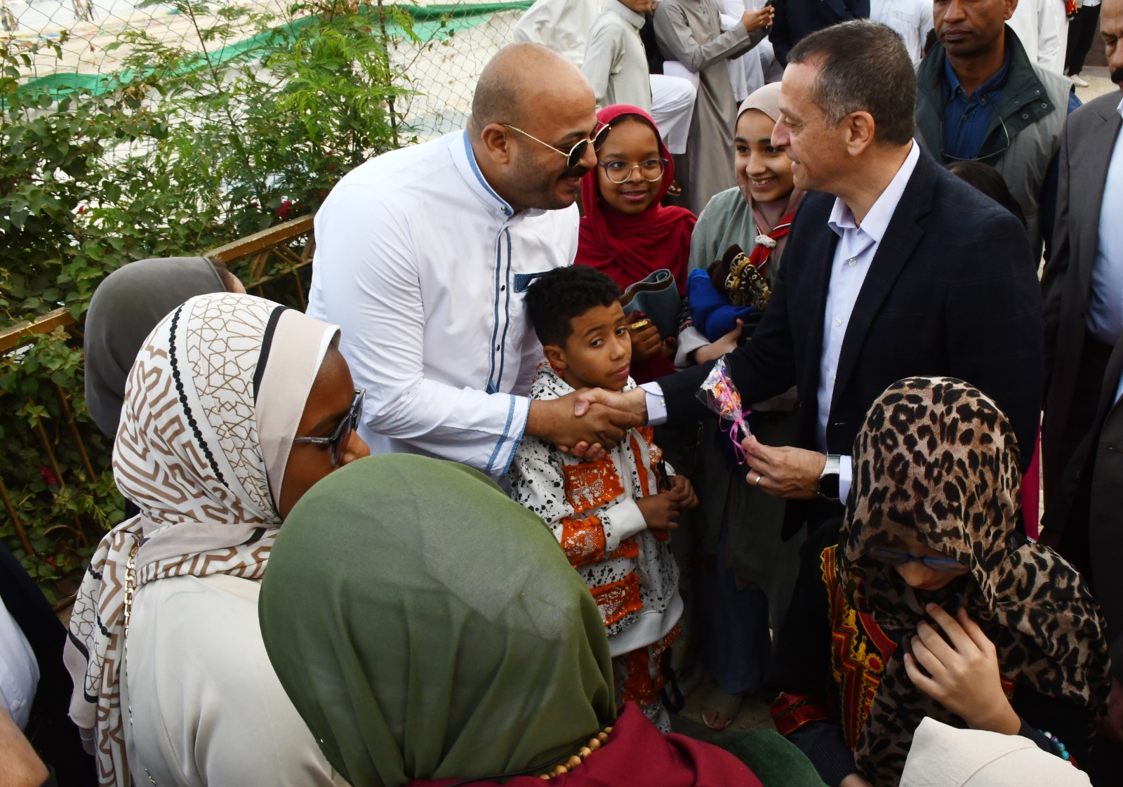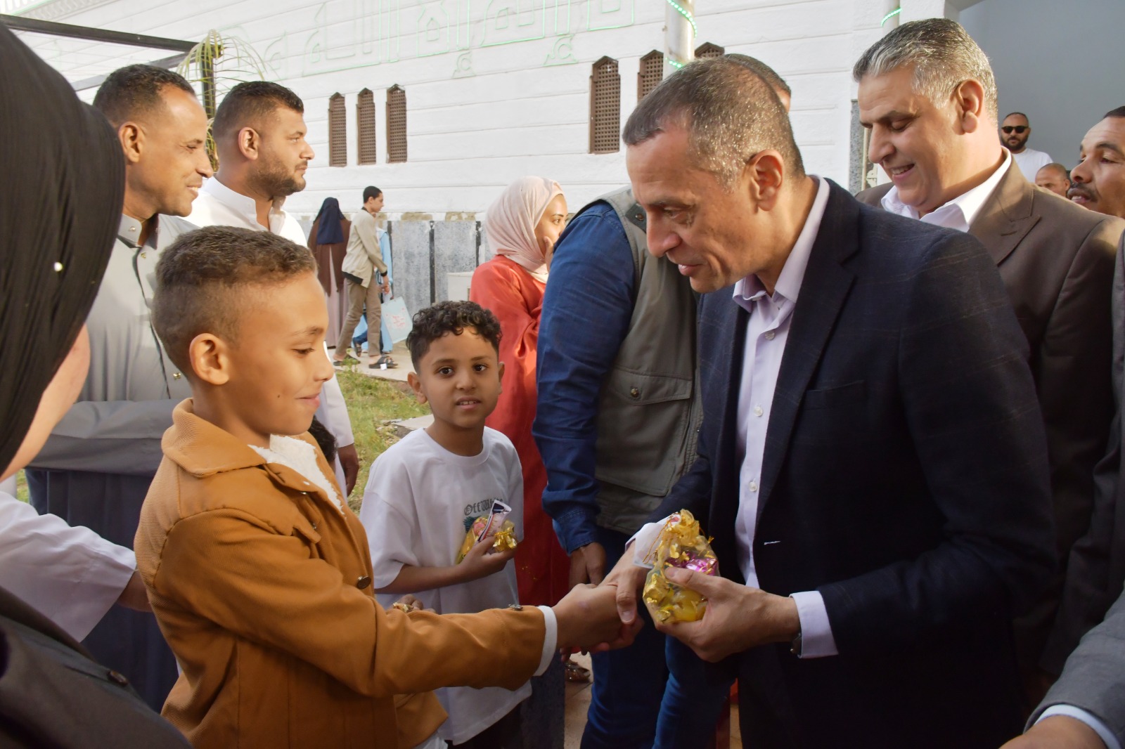 فيما قام محافظ أسوان عقب صلاة العيد بتوزيع كروت ملونة خاصة بتهنئة رئيس الجمهورية ، وأيضاً الهدايا والعيدية على الأطفال ، وحرص كذلك على إلتقاط الصور التذكارية مع الأطفال وأسرهم مما أضفى حالة من البهجة والسرور والسعادة أمام المسجد، وأيضاً بإمتداد كورنيش النيل.