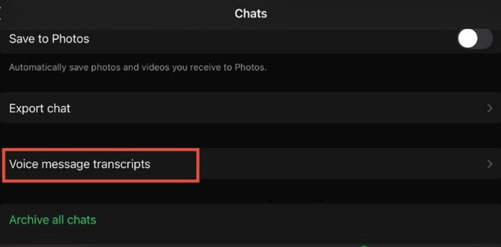- اذهب إلى الإعدادات > الدردشات > نسخ الرسائل الصوتية > التفعيل> اختر لغة النسخ> بعد ذلك سيظهر خيار “Transcribe” لكل رسالة صوتية.