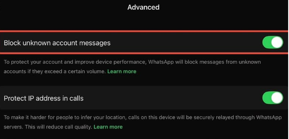 - اذهب إلى إعدادات واتساب > ثم الخصوصية > ثم متقدم> قم بتفعيل خيار “حظر رسائل الحسابات غير المعروفة”