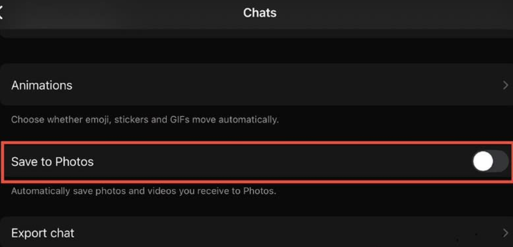 - اذهب إلى إعدادات واتساب> ثم الدردشات> ثم تعطيل “حفظ في الصور” أو “ظهور الوسائط”