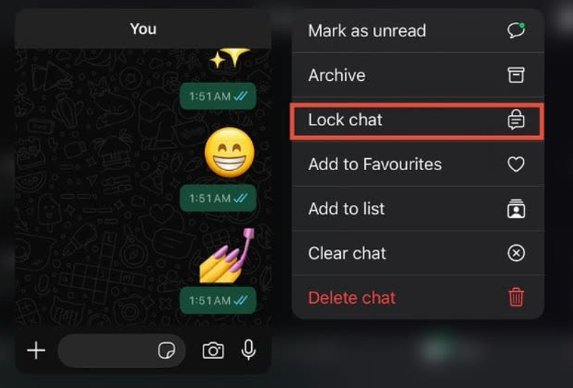 - اضغط مطولا على المحادثة التي تريد قفلها> انقر على خيار “قفل الدردشة”> ثم أدخل رمز الحماية