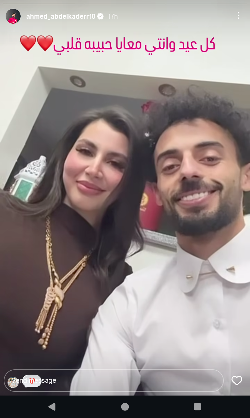 وظهر عبد القادر في الصورة رفقة زوجتة، معلقاً:"كل عيد وانتي معايا حبيبة قلبي".