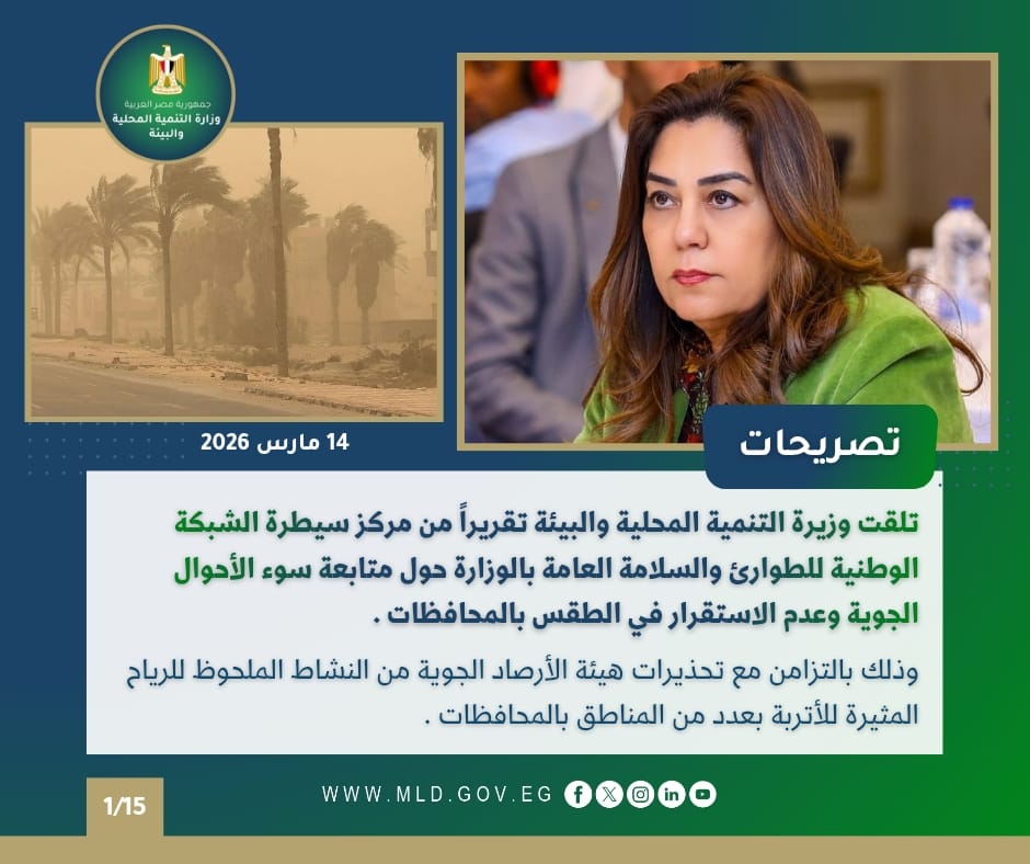 كما تلقت الدكتورة منال عوض وزير التنمية المحلية والبيئة، تقريرًا بشأن ما رصده مركز سيطرة الشبكة الوطنية للطوارئ والسلامة العامة ومركز إدارة الأزمات بالوزارة من تغيرات طارئة في حالة الطقس وسوء الأحوال الجوية الذي تتعرض له المحافظات بالتزامن مع تحذيرات هيئة الأرصاد الجوية من النشاط الملحوظ للرياح المثيرة للأتربة بعدد من المناطق بالمحافظات .