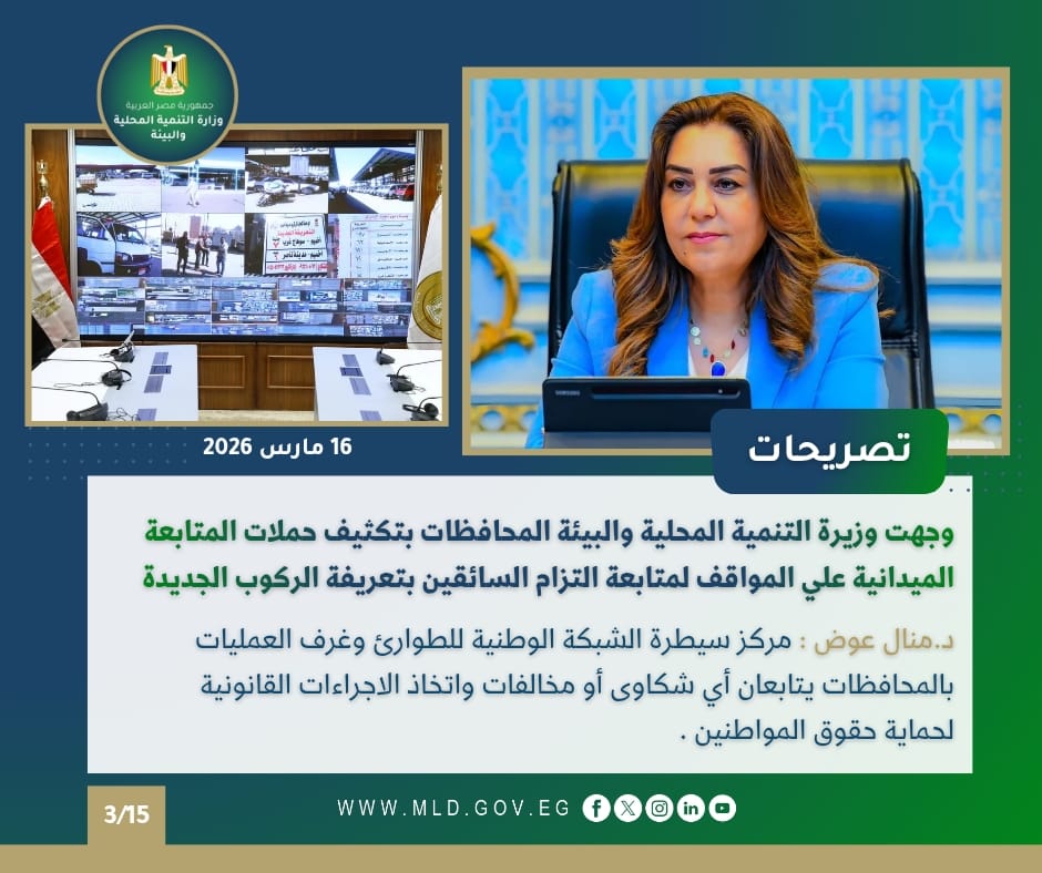 ووجهت الدكتورة منال عوض وزيرة التنمية المحلية والبيئة، السادة المحافظين بتكثيف حملات المتابعة والرقابة الميدانية الدورية على مواقف السيارات لجميع المواصلات العامة للخطوط الداخلية والخارجية ( سيارات الميكروباص - السرفيس - النقل الجماعى ) للمتابعة على أرض الواقع لالتزام السائقين بالتعريفة المحددة بعد الزيادة، خاصة مع قرب حلول عيد الفطر المبارك، بما يضمن الانضباط داخل منظومة النقل ومنع أي ممارسات استغلالية للمواطنين.