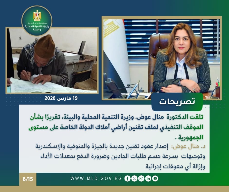 كما تلقت الدكتورة منال عوض، وزيرة التنمية المحلية والبيئة، تقريرًا بشأن الموقف التنفيذي لملف تقنين أراضي أملاك الدولة الخاصة على مستوى الجمهورية وذلك في إطار تنفيذ توجهات الدولة نحو استرداد حقوقها وتقنين أوضاع المواطنين الجادين، حيث تم الانتهاء من تحرير عدد من عقود التقنين للمواطنين بمحافظات الجيزة والمنوفية والإسكندرية، وذلك للحالات التي أثبتت جديتها في استيفاء الاشتراطات وسداد المستحقات المالية المقررة وفقًا للأطر القانونية المنظمة، بما يعكس انتظام العمل داخل منظومة التقنين وتسارع وتيرة الإنجاز بالمحافظات.