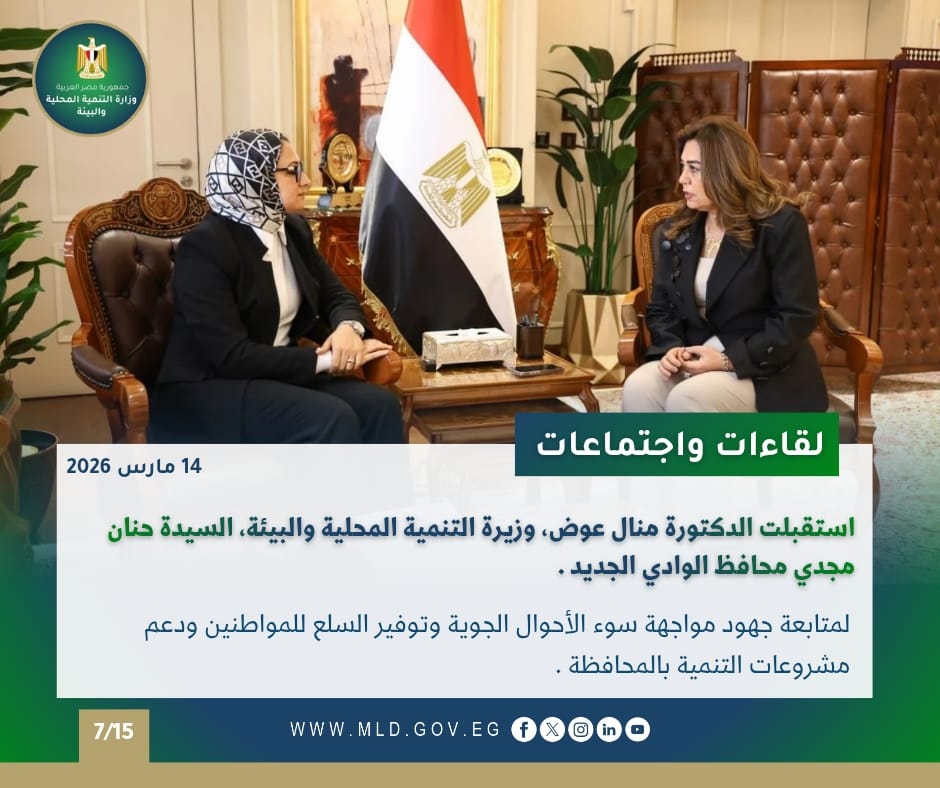 واستقبلت الدكتورة منال عوض، وزيرة التنمية المحلية والبيئة، بمقر الوزارة بالعاصمة الجديدة، السيدة حنان مجدي محافظ الوادي الجديد، وذلك في إطار اللقاءات الدورية التي تعقدها الوزيرة مع المحافظين لمتابعة الموقف التنفيذي لعدد من الملفات التنموية والحيوية بالمحافظات، والوقوف على مستجدات العمل والخدمات المقدمة للمواطنين.