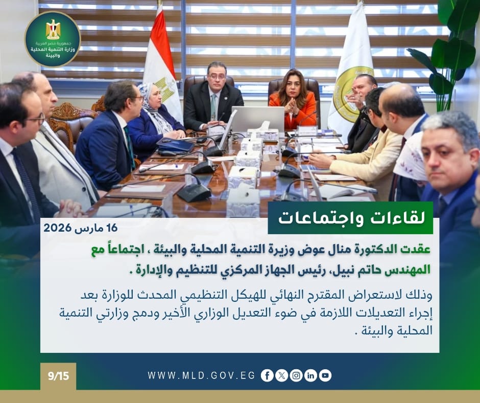 عقدت الدكتورة منال عوض وزيرة التنمية المحلية والبيئة ، اجتماعاً مع المهندس حاتم نبيل، رئيس الجهاز المركزي للتنظيم والإدارة، بمقر الوزارة بالعاصمة الجديدة، وذلك لاستعراض المقترح النهائي للهيكل التنظيمي المحدث للوزارة بعد إجراء التعديلات اللازمة في ضوء التعديل الوزاري الأخير ودمج وزارتي التنمية المحلية والبيئة .