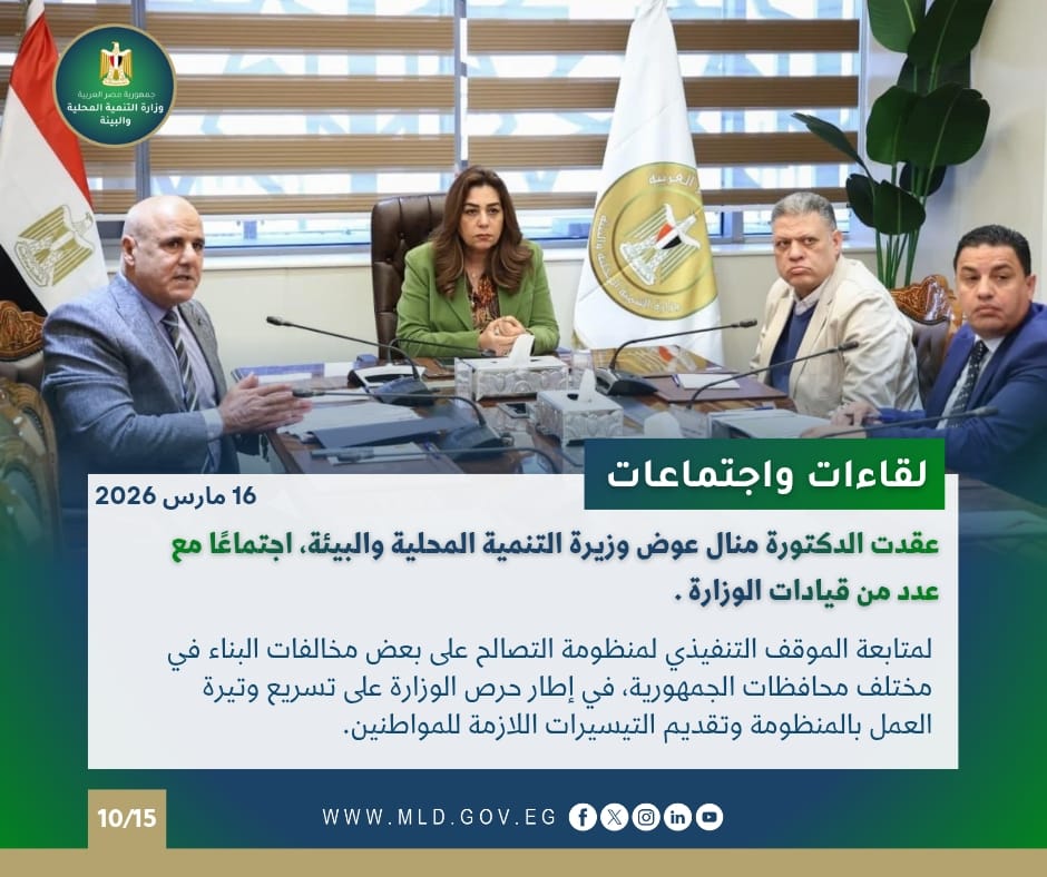 كما عقدت الدكتورة منال عوض وزيرة التنمية المحلية والبيئة، اجتماعًا مع عدد من قيادات الوزارة لمتابعة الموقف التنفيذي لمنظومة التصالح على بعض مخالفات البناء في مختلف محافظات الجمهورية، في إطار حرص الوزارة على تسريع وتيرة العمل بالمنظومة وتقديم التيسيرات اللازمة للمواطنين.