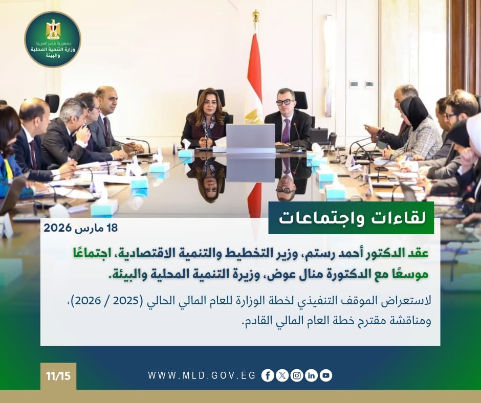 وعقد الدكتور أحمد رستم، وزير التخطيط والتنمية الاقتصادية، اجتماعًا موسعًا مع الدكتورة منال عوض، وزيرة التنمية المحلية والبيئة، لاستعراض الموقف التنفيذي لخطة الوزارة للعام المالي الحالي (2025 / 2026)، ومناقشة مقترح خطة العام المالي القادم.