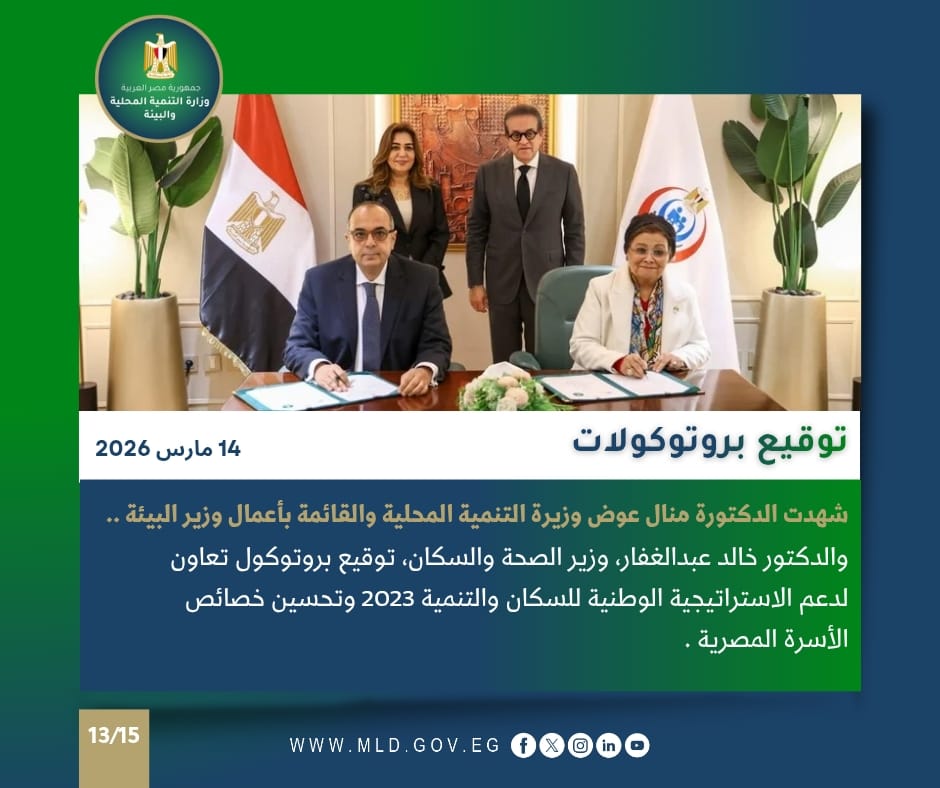 شهدت الدكتورة منال عوض، وزيرة التنمية المحلية والبيئة، والدكتور خالد عبدالغفار، وزير الصحة والسكان، توقيع بروتوكول تعاون مشترك لتحقيق أهداف الاستراتيجية الوطنية للسكان والتنمية 2030، والخطة العاجلة للسكان والتنمية، وتعزيز التوازن بين النمو السكاني والاقتصادي، وتحسين جودة حياة الأسرة المصرية، في إطار توجه الدولة نحو تحسين الخصائص السكانية ودعم التنمية المستدامة.