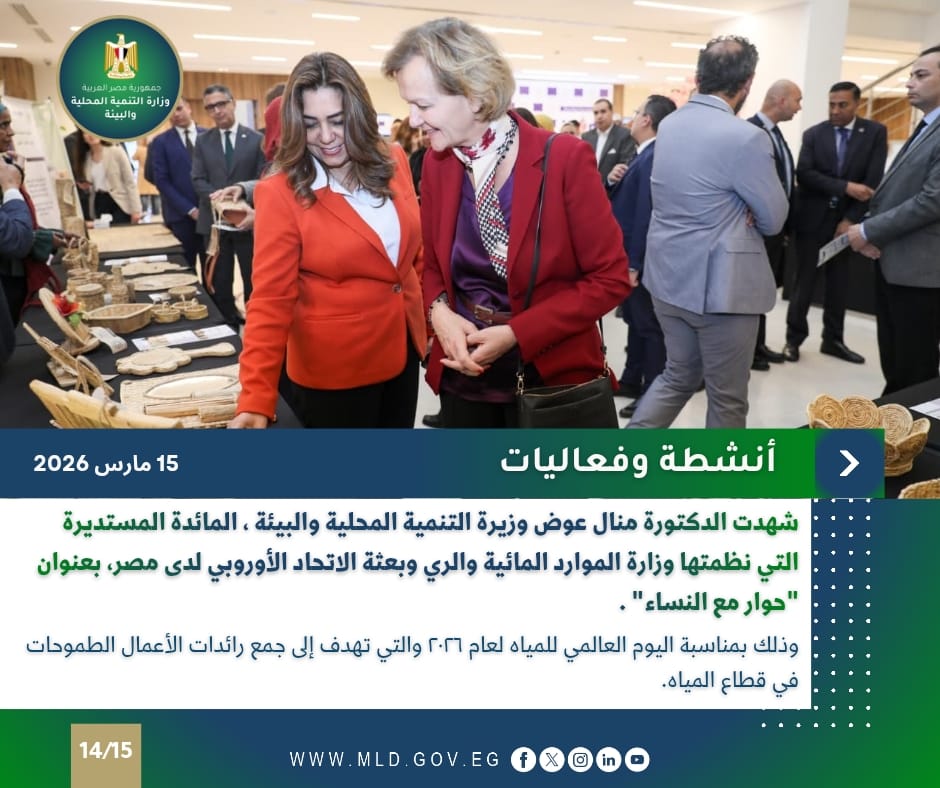 كما شهدت الدكتورة منال عوض وزيرة التنمية المحلية والبيئة، المائدة المستديرة التي نظمتها وزارة الموارد المائية والري وبعثة الاتحاد الأوروبي لدى مصر، بعنوان "حوار مع النساء"، وذلك بمناسبة اليوم العالمي للمياه لعام ٢٠٢٦ والتي تهدف إلى جمع رائدات الأعمال الطموحات في قطاع المياه.