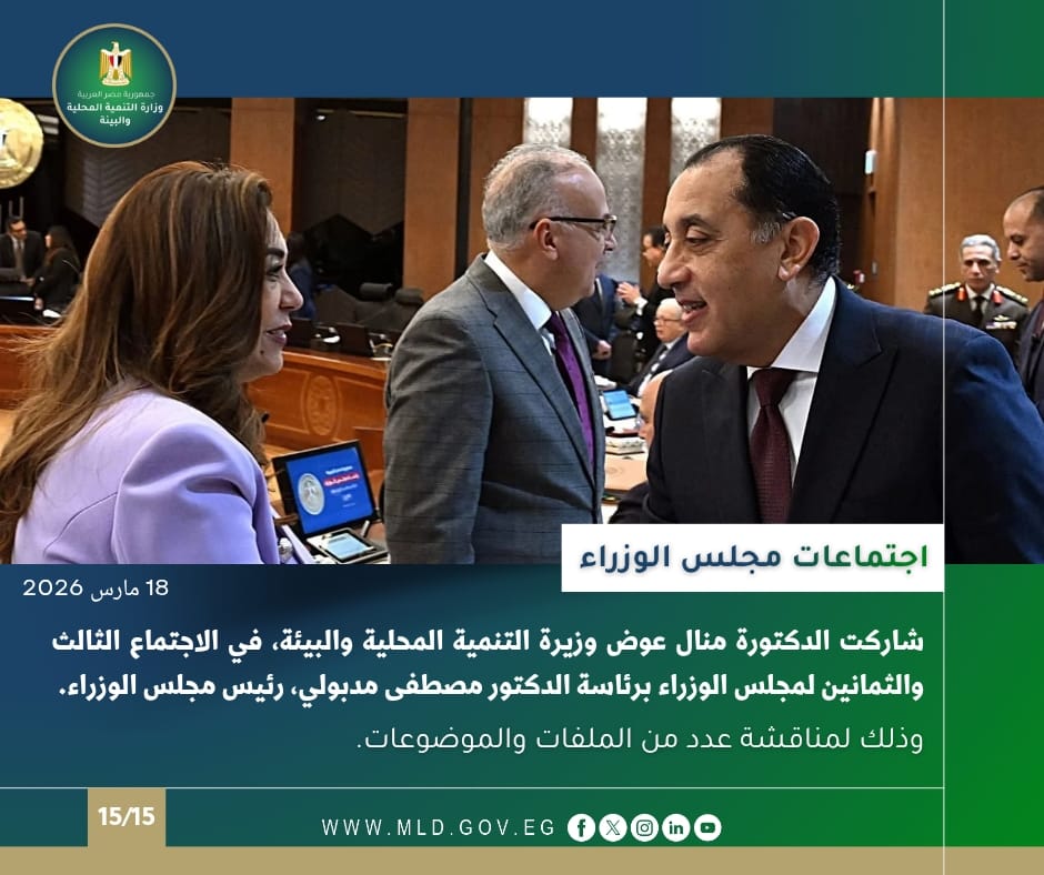 كما شاركت الدكتورة منال عوض وزيرة التنمية المحلية والبيئة في الاجتماع الأسبوعي للحكومة بمقرها في العاصمة الجديدة؛ برئاسة الدكتور مصطفى مدبولي رئيس مجلس الوزراء، وذلك لمناقشة عدد من الموضوعات والملفات.