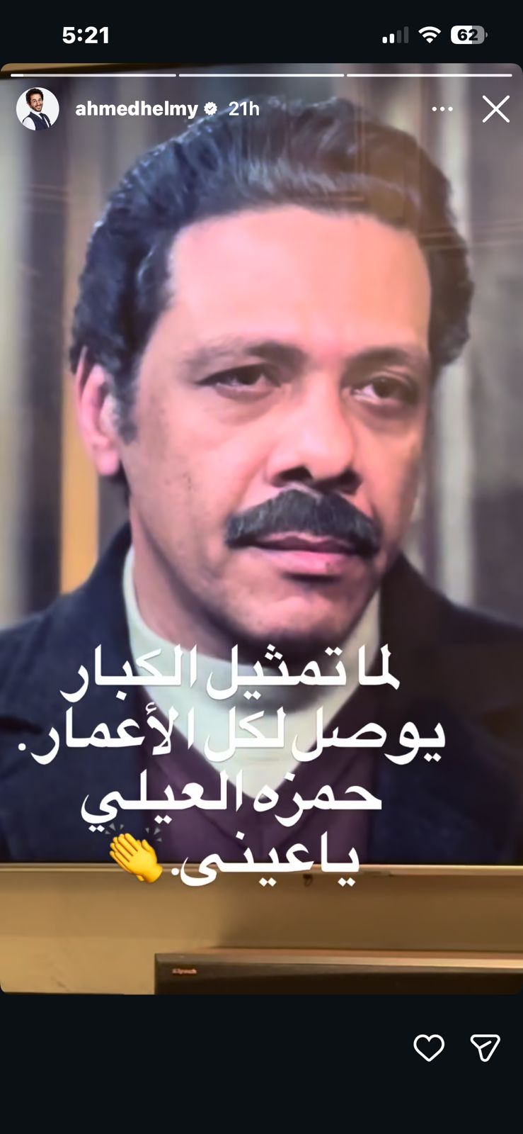 وكتب أحمد حلمي عبر صفحته على موقع التواصل الاجتماعي إنستجرام: "لما تمثيل الكبار يوصل لكل الأعمار.. حمزة العيلي يا عيني".