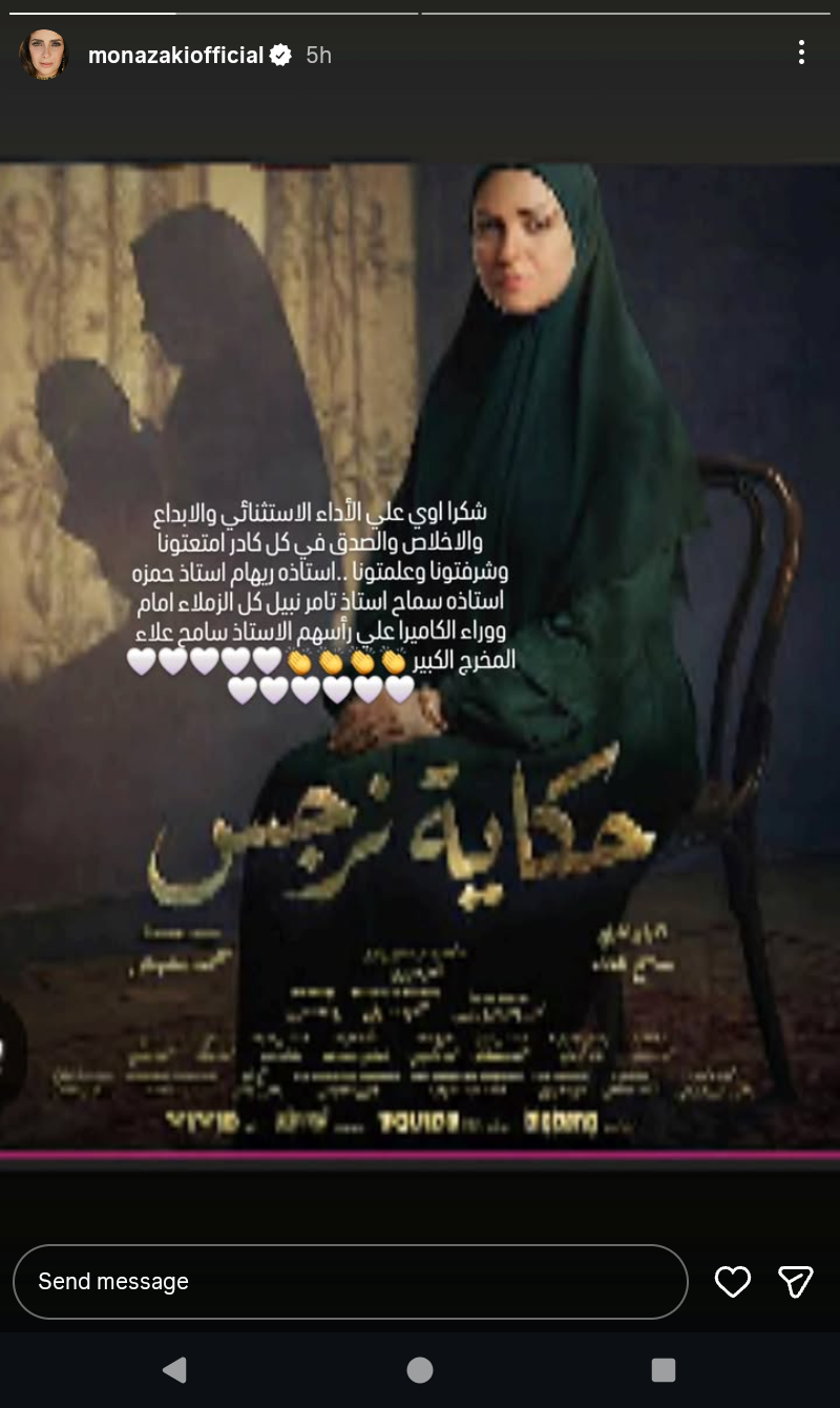 أشادت الفنانة مني زكي بدور الفنانه ريهام عبد الغفور وممثلي مسلسل حكاية نرجس الذي كان يعرض خلال الموسم الرمضاني 2026.
