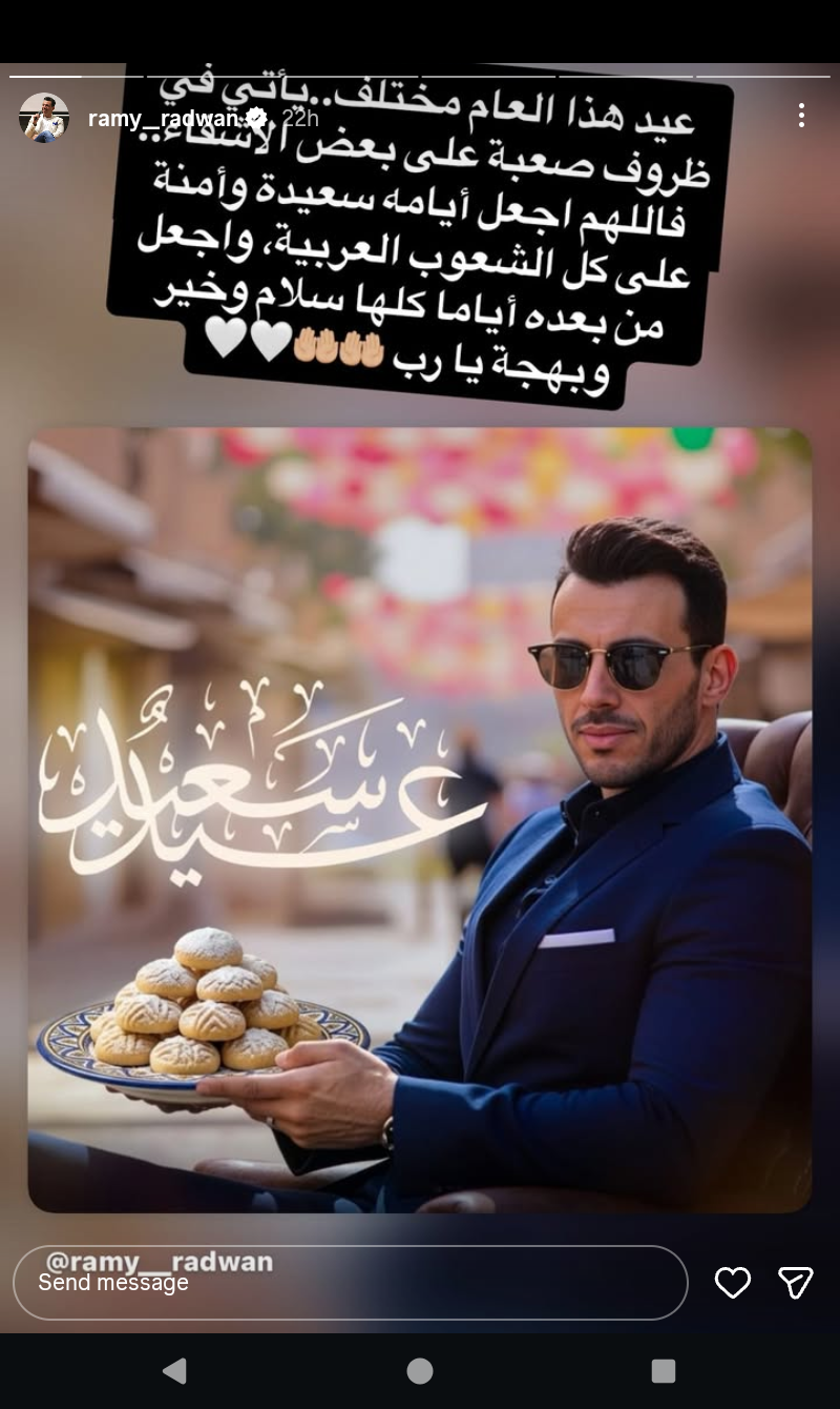 وظهر رامي رضوان في الصورة بخاصية الـ ai ، معلقاً :"عيد هذا العام مختلف.. يأتي في ظروف صعبة على بعض الاشقاء فاللهم اجعل أيامه سعيدة وأمنة على كل الشعوب العربية، واجعل من بعده أياما كلها سلام وخير وبهجة يا رب..عيد سعيد".