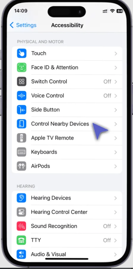 3. ضمن قسم إمكانية الوصول Accessibility، اختر التحكم بالأجهزة القريبة Control Nearby Devices.