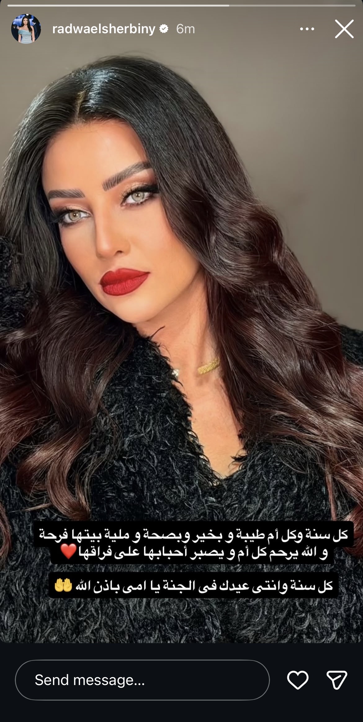 وكتبت رضوى الشربيني، عبر ستوري انستجرام: “كل سنة وكل أم طيبة وبخير وبصحة ملية بيتها فرحة والله يرحم كل أم ويصبر أحبابها على فراقها كل سنة وانتي عيدك في الجنة يا أمي بإذن الله”.